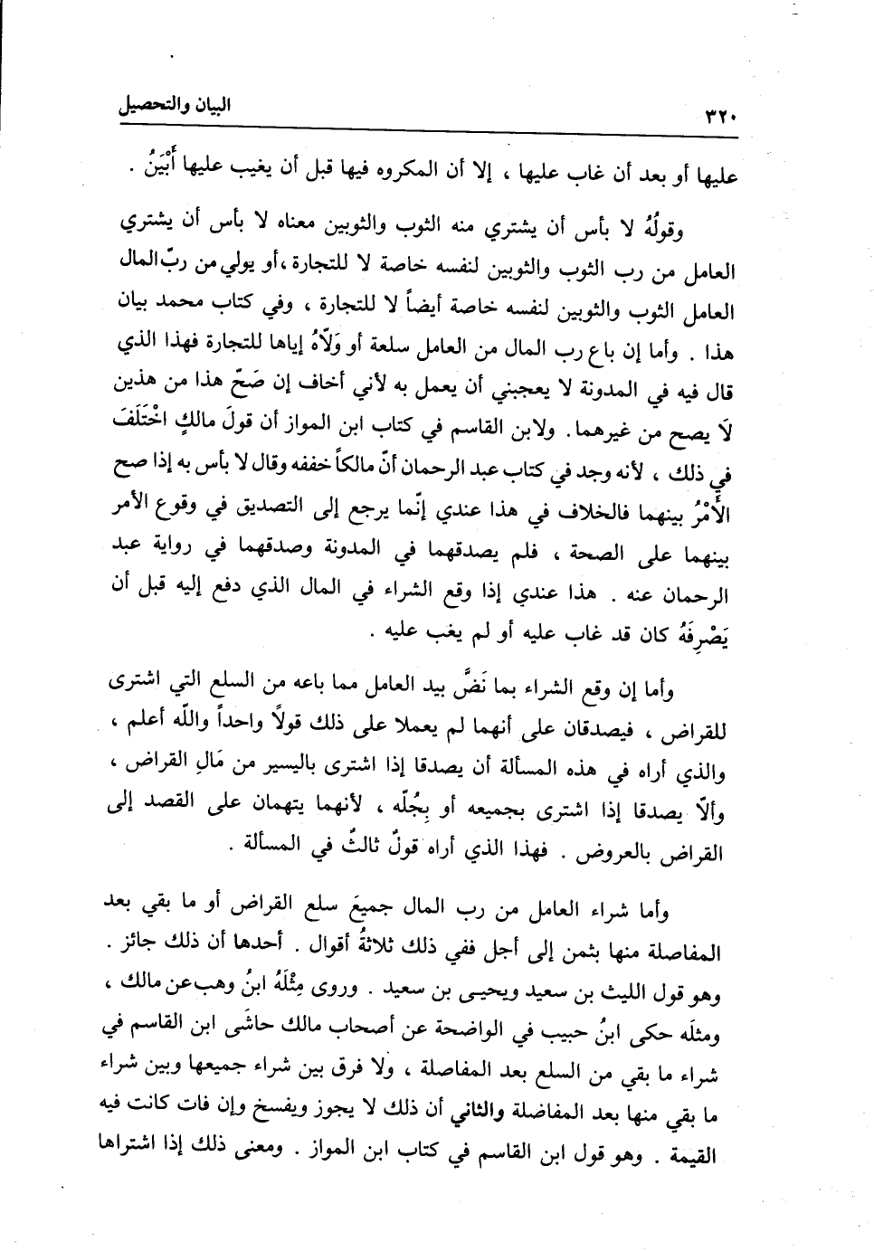 ولابن القاسم في كتاب ابن المواز أن قول مالك اختلف في ذلك؛ لأنه وجد في كتاب عبد الرحمن أن مالكا خففه، وقال: لا بأس به إذا صح الأمر بينهما فالخلاف في هذا عندي إنما يرجع إلى التصديق في وقوع الأمر بينهما على الصحة، فلم يصدقهما في المدونة وصدقهما في رواية عبد الرحمن عنه. هذا عندي إذا وقع الشراء في المال الذي دفع إليه قبل أن يصرفه كان قد غاب عليه أولم يغب عليه.