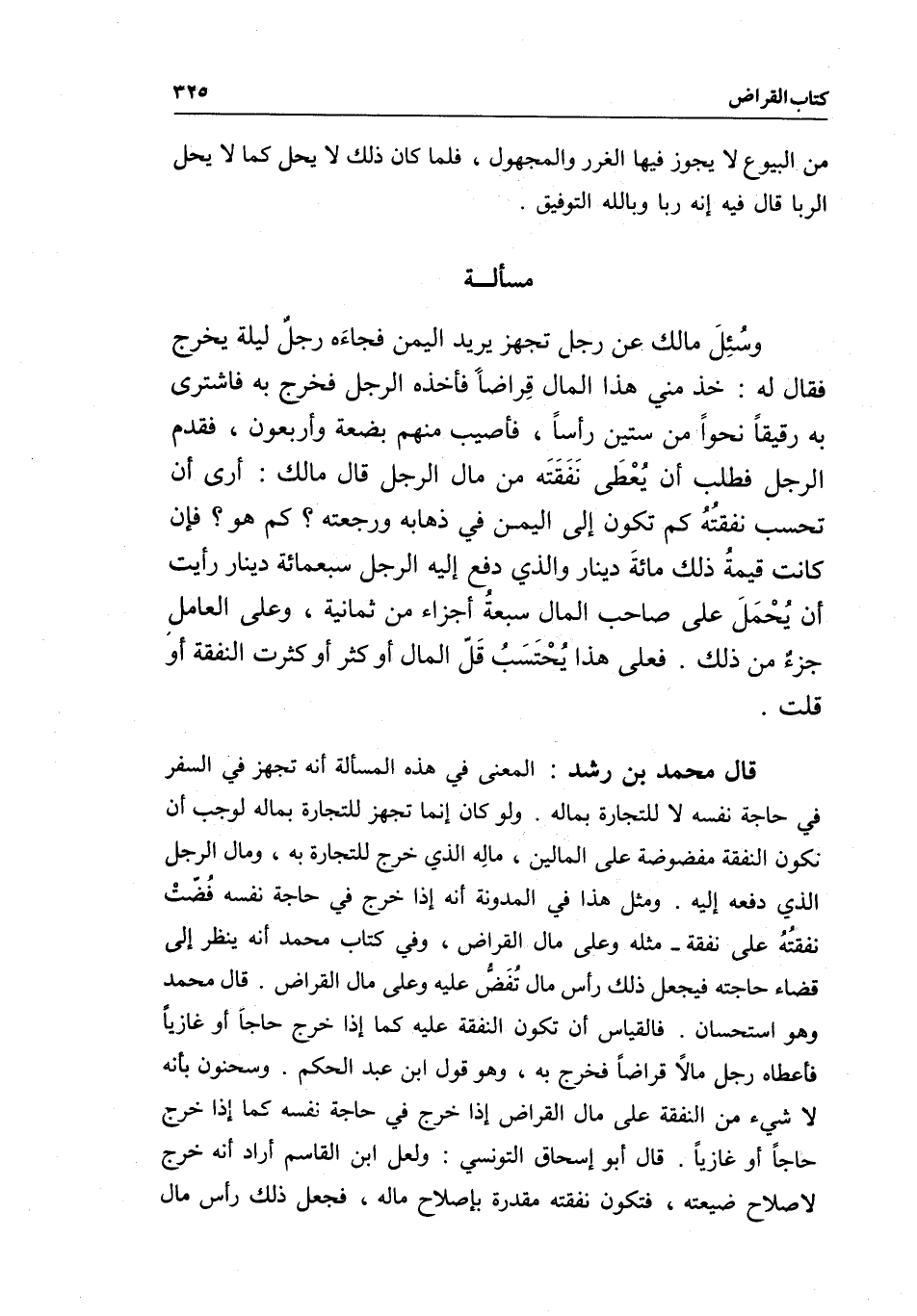مسألة وسئل مالك عن رجل تجهز يريد اليمن فجاءه رجل ليلة يخرج فقال له: خذ مني هذا المال قراضا فأخذه الرجل فخرج به فاشترى به رقيقا نحوا من ستين رأسا، فأصيب منهم بضعة وأربعون، فقدم الرجل فطلب أن يعطى نفقته من مال الرجل، قال مالك: أرى أن تحسب نفقته كم تكون إلى اليمن في ذهابه ورجعته، كم هو؟ فإن كانت قيمة ذلك مائة دينار والذي دفع إليه الرجل سبعمائة دينار رأيت أن يحمل على صاحب المال سبعة أجزاء من ثمانية، وعلى العامل جزء من ذلك. فعلى هذا يحتسب قل المال أو كثر أو كثرت النفقة أو قلت.