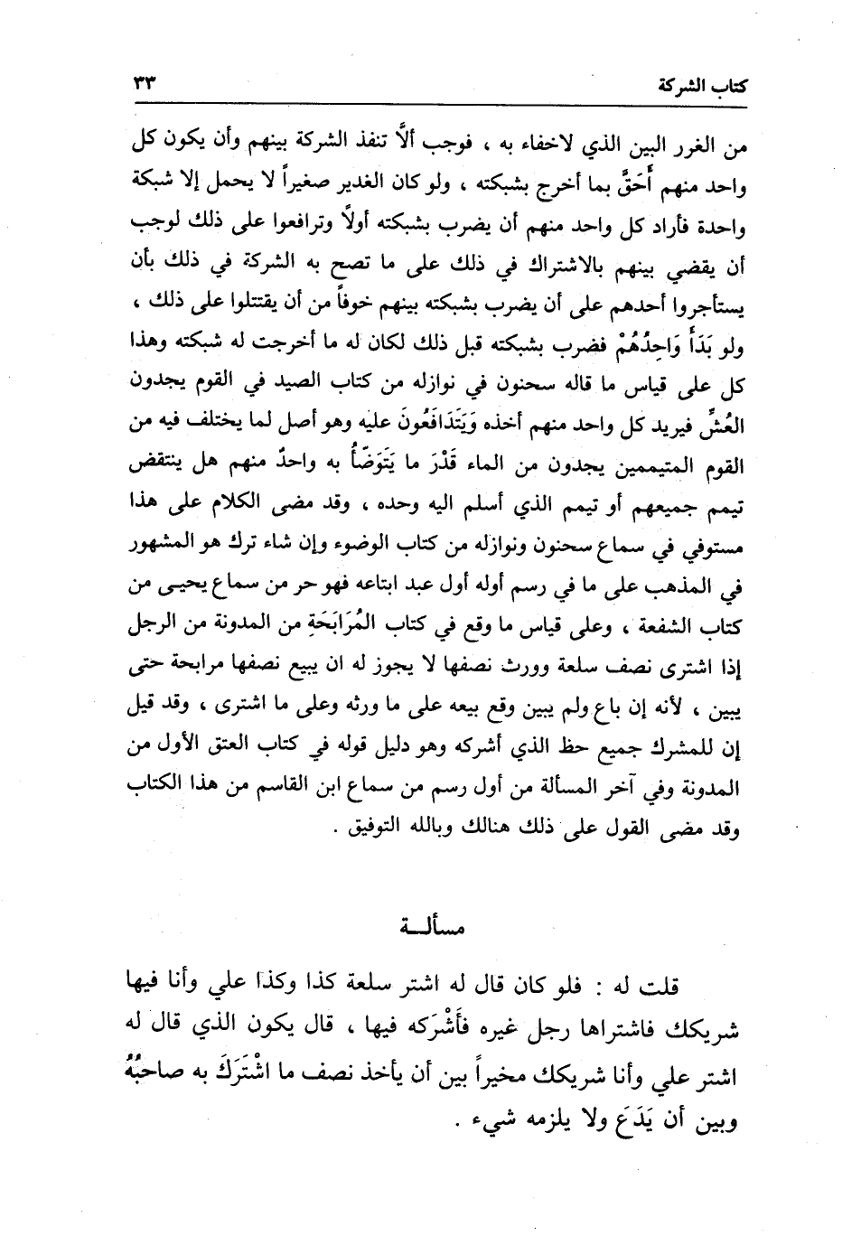 من الغرر البين الذي لا خفاء به، فوجب ألا تنفذ الشركة بينهم وأن يكون كل واحد منهم أحق بما أخرج بشبكته، ولو كان الغدير صغيرا لا يحمل إلا شبكة واحدة فأراد كل واحد منهم أن يضرب بشبكته أولا وترافعوا على ذلك لوجب أن يقضي بينهم بالاشتراك في ذلك على ما تصح به الشركة في ذلك بأن يستأجروا أحدهم على أن يضرب بشبكته بينهم خوفا من أن يقتتلوا على ذلك ولو بدأ واحدهم فضرب بشبكته قبل ذلك لكان له ما أخرجت له شبكته وهذا كل على قياس ما قاله سحنون في نوازله من كتاب الصيد في القوم يجدون العش فيريد كل واحد منهم أخذه ويتدافعون عليه وهو أصل لما يختلف فيه من القوم المتيممين يجدون من الماء قدر ما يتوضأ به واحد منهم هل ينتقض تيمم جميعهم أو تيمم الذي أسلم إليه وحده، وقد مضى الكلام على هذا مستوفى في سماع سحنون ونوازله من كتاب الوضوء وإن شاء ترك هو المشهور في المذهب على ما في رسم أوله أول عبد ابتاعه فهو حر من سماع يحيى من كتاب الشفعة، وعلى قياس ما وقع في كتاب المرابحة من المدونة من الرجل إذا اشترى نصف سلعة وورث نصفها لا يجوز له أن يبيع نصفها مرابحة حتى يبين؛ لأنه إن باع ولم يبين وقع بيعه على ما ورثه وعلى ما اشترى، وقد قيل: إن للمشرك جميع حظ الذي أشركه وهو دليل قوله في كتاب العتق الأول من المدونة وفي آخر المسألة من أول رسم من سماع ابن القاسم من هذا الكتاب وقد مضى القول على ذلك هنالك وبالله التوفيق.