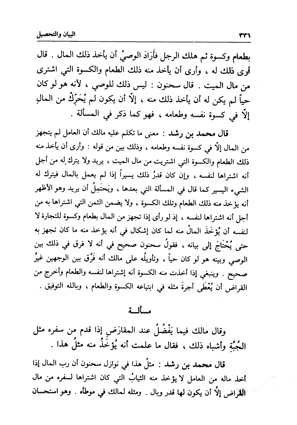 قال محمد بن رشد: مثل هذا في نوازل سحنون أن رب المال إذا أخذ ماله من العامل لا يؤخذ منه الثياب التي كان اشتراها لسفره من مال القراض إلا أن يكون لها قدر وبال. ومثله لمالك في موطئه. وهو استحسان