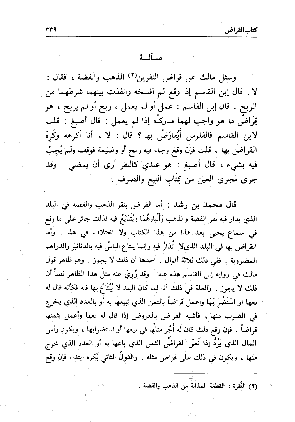 قال محمد بن رشد: أما القراض بنقر الذهب والفضة في البلد الذي يدار فيه نقر الفضة والذهب وأتبارهما ويتبايع فيه فذلك جائز على ما وقع في سماع يحيى بعد هذا من هذا الكتاب ولا اختلاف في هذا.