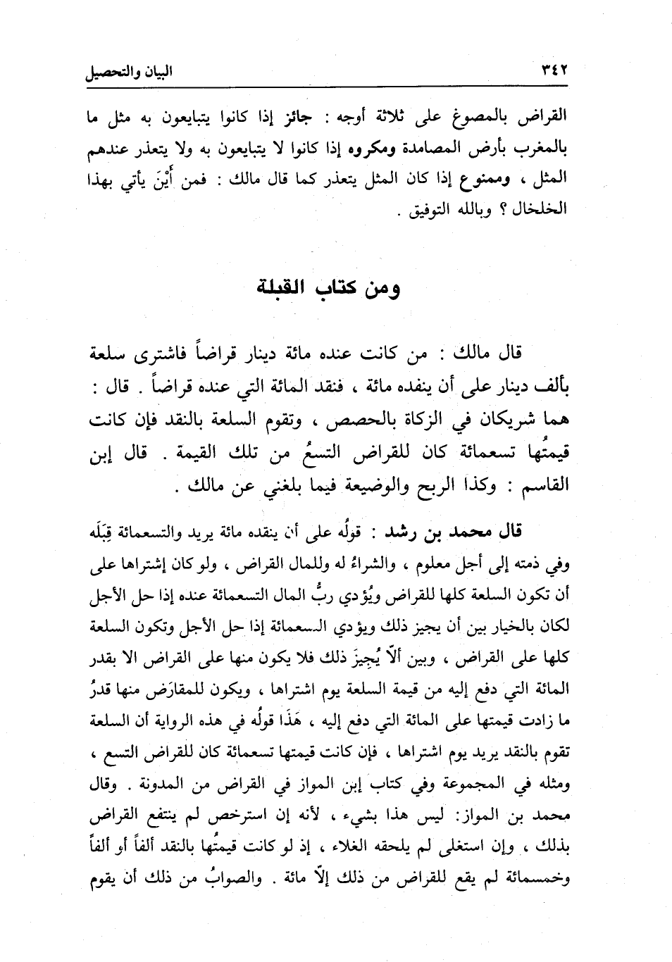 قال محمد بن رشد: قوله على أن ينقده مائة، يريد: والتسعمائة قبله وفي ذمته إلى أجل معلوم، والشراء له وللمال القراض، ولو كان اشتراها على أن تكون السلعة كلها للقراض ويؤدي رب المال التسعمائة عنده إذا حل الأجل لكان بالخيار بين أن يجيز ذلك ويؤدي التسعمائة إذا حل الأجل وتكون السلعة كلها على القراض، وبين ألا يجيز ذلك فلا يكون منها على القراض إلا بقدر المائة التي دفع إليه من قيمة السلعة يوم اشتراها، ويكون للمقارض منها قدر ما زادت قيمتها على المائة التي دفع إليه، هذا قوله في هذه الرواية أن السلعة تقوم بالنقد يريد يوم اشتراها، فإن كانت قيمتها تسعمائة كان للقراض التسع، ومثله في المجموعة وفي كتاب ابن المواز في القراض من المدونة. وقال محمد بن المواز: ليس هذا بشيء؛ لأنه إن استرخص لم ينتفع القراض بذلك، وإن استغلى لم يلحقه الغلاء، إذ لو كانت قيمتها بالنقد ألفا أو ألفا وخمسمائة لم يقع للقراض من ذلك إلا مائة.