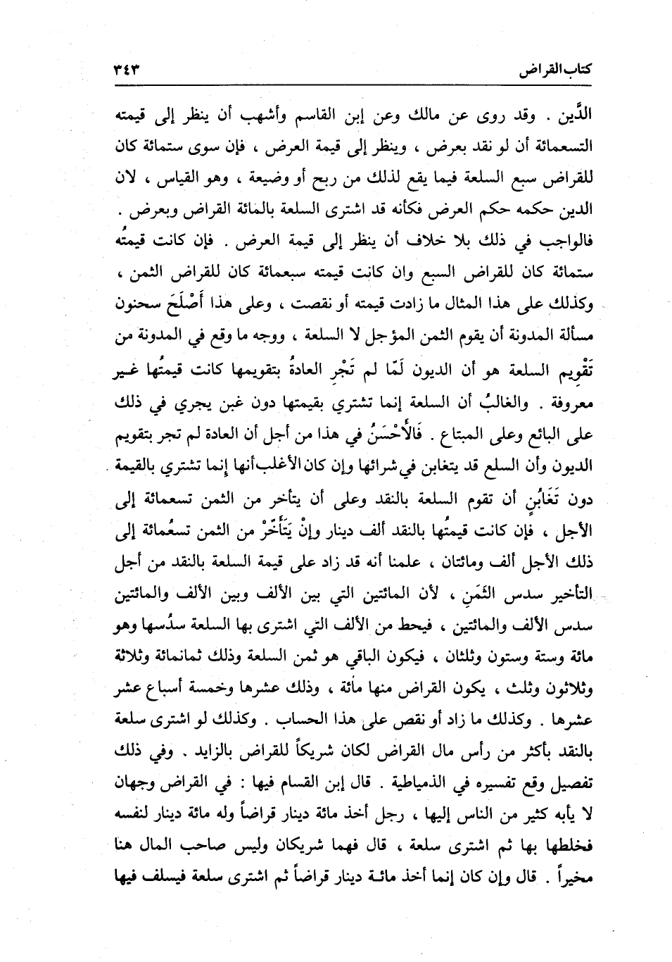 فإن كانت قيمته ستمائة كان للقراض السبع وإن كانت قيمته سبعمائة كان للقراض الثمن، وكذلك على هذا المثال ما زادت قيمته أو نقصت، وعلى هذا أصلح سحنون مسألة المدونة أن يقوم الثمن المؤجل لا السلعة، ووجه ما وقع في المدونة من تقويم السلعة هو أن الديون لما لم تجر العادة بتقويمها كانت قيمتها غير معروفة.