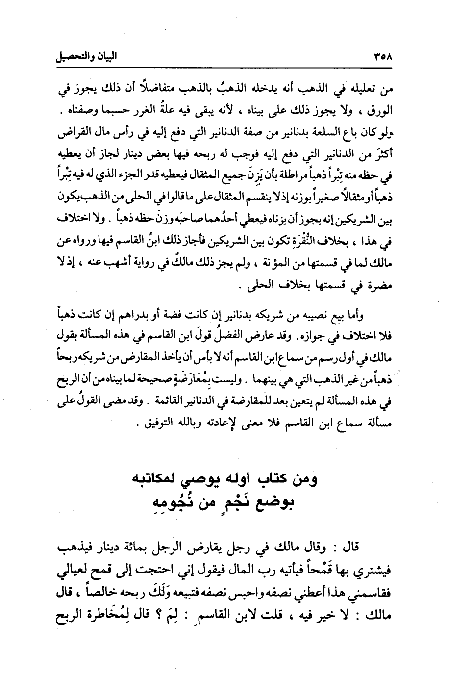 ومن كتاب أوله يوصي لمكاتبه بوضع نجم من نجومه قال: وقال مالك، في رجل يقارض الرجل بمائة دينار فيذهب فيشتري بها قمحا فيأتيه رب المال، فيقول: إني احتجت إلى قمح لعيالي فقاسمني هذا، أعطني نصفه واحبس نصفه فتبيعه ولك ربحه خالصا، قال مالك: لا خير فيه، قلت لابن القاسم: لم؟ قال: لمخاطرة الربح