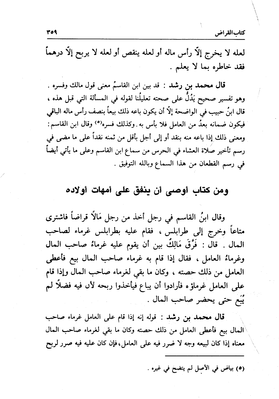 قال محمد بن رشد: قد بين ابن القاسم معنى قول مالك وفسره. وهو تفسير صحيح يدل على صحته تعليلنا لقوله في المسألة التي قبل هذه، قال ابن حبيب في الواضحة: إلا أن يكون باعه ذلك بيعا بنصف رأس ماله الباقي فيكون ضمانه بعد من العامل فلا بأس به. وكذلك فسره، وقال ابن القاسم: ومعنى ذلك إذا باعه منه بنقد أو إلى أجل بأقل من ثمنه نقدا على ما مضى في رسم تأخير صلاة العشاء في الحرس من سماع ابن القاسم، وعلى ما يأتي أيضا في رسم القطعان من هذا السماع، وبالله التوفيق.