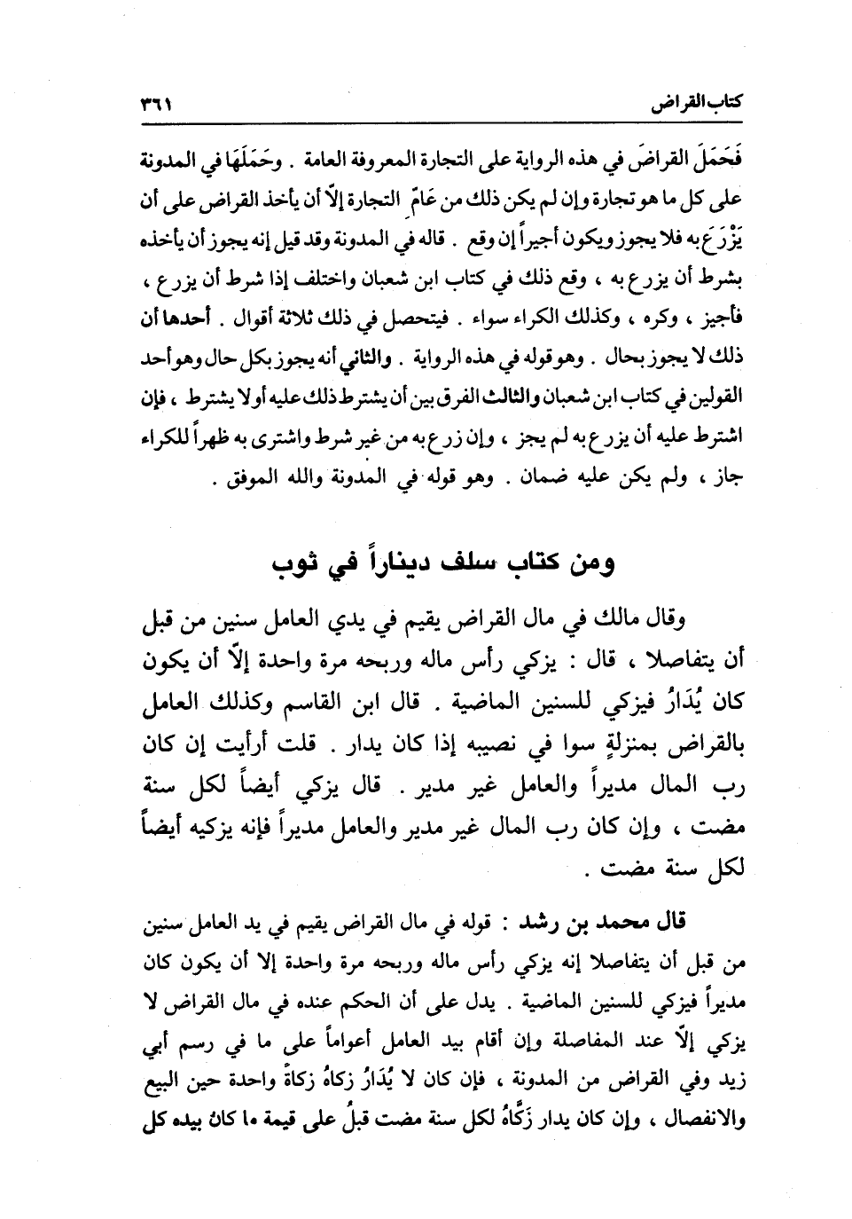 قال محمد بن رشد: قوله في مال القراض يقيم في يد العامل سنين من قبل أن يتفاصلا إنه يزكي رأس ماله وربحه مرة واحدة إلا أن يكون كان مديرا فيزكي للسنين الماضية.