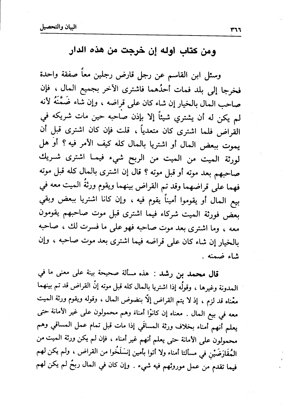 ومن كتاب أوله إن خرجت من هذه الدار وسئل ابن القاسم: عن رجل قارض رجلين معا صفقة واحدة فخرجا إلى بلد فمات أحدهما فاشترى الآخر بجميع المال، فإن صاحب المال بالخيار إن شاء كان على قراضه، وإن شاء ضمنه لأنه لم يكن له أن يشتري شيئا إلا بإذن صاحبه حين مات شريكه في القراض فلما اشترى كان متعديا، قلت: فإن كان اشترى قبل أن يموت ببعض المال أو اشتريا بالمال كله كيف الأمر فيه؟ أو هل لورثة الميت من الميت من الربح شيء فيما اشترى شريك صاحبهم بعد موته أو قبل موته؟ قال: إن اشترى بالمال كله قبل موته فهما على قراضهما وقد تم القراض بينهما ويقوم ورثة الميت معه في بيع المال أو يقوموا أمينا يقوم فيه، وإن كانا اشتريا ببعض وبقي بعض فورثة الميت شركاء فيما اشترى قبل موت صاحبهم يقومون معه، وما اشترى بعد موت صاحبه فهو على ما فسرت لك، صاحبه بالخيار إن شاء كان على قراضه فيما اشترى بعد موت صاحبه، وإن شاء ضمنه.