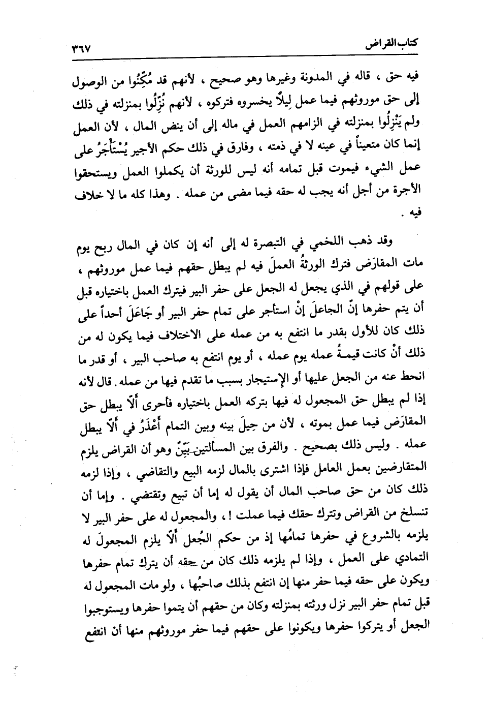 وقد ذهب اللخمي في التبصرة له إلى أنه إن كان في المال ربح يوم مات المقارض فترك الورثة العمل فيه لم يبطل حقهم فيما عمل موروثهم، على قولهم في الذي يجعل له الجعل على حفر البئر فيترك العمل باختياره قبل أن يتم حفرها إن الجاعل إن استأجر على تمام حفر البئر أو جاعل أحدا على ذلك كان للأول بقدر ما انتفع به من عمله على الاختلاف فيما يكون له من ذلك إن كانت قيمة عمله يوم عمله، أو يوم انتفع به صاحب البئر، أو قدر ما انحط عنه من الجعل عليها أو الاستئجار بسبب ما تقدم فيها من عمله.