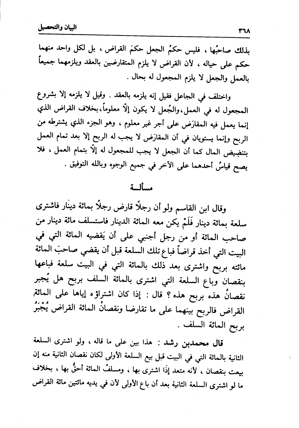 مسألة وقال ابن القاسم: ولو أن رجلا قارض رجلا بمائة دينار فاشترى سلعة بمائة دينار فلم يكن معه المائة الدينار فاستسلف مائة دينار من صاحب المائة أو من رجل أجنبي على أن يقضيه المائة التي في البيت التي أخذ قراضا فباع تلك السلعة قبل أن يقضي صاحب المائة مائته بربح واشترى بعد ذلك بالمائة التي في البيت سلعة فباعها بنقصان وباع السلعة التي اشترى بالمائة السلف بربح هل يجبر نقصان هذه بربح هذه؟ قال: إذا كان اشتراؤه إياها على المائة القراض فالربح بينهما على ما تقارضا ونقصان المائة القراض يجبر بربح المائة السلف.