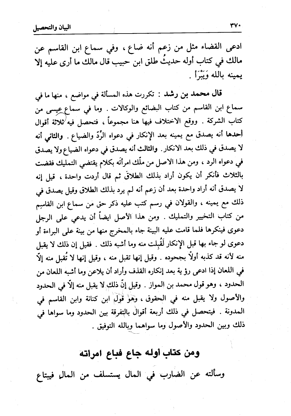 قال محمد بن رشد: تكررت هذه المسألة في مواضع، منها ما في سماع ابن القاسم من كتاب البضائع والوكالات. وما في سماع عيسى من كتاب الشركة.
