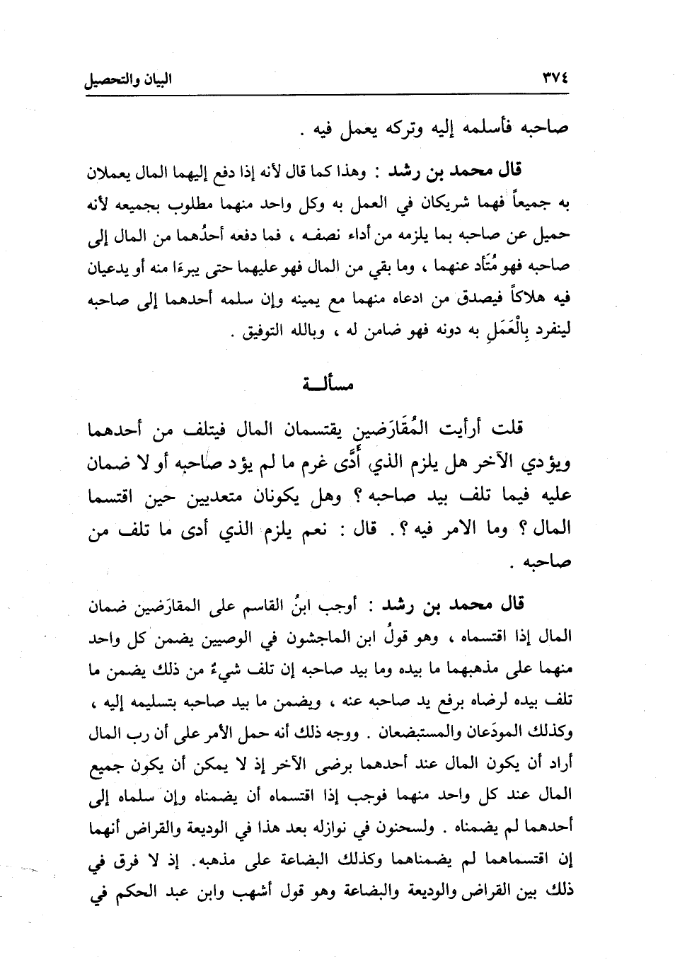 قال محمد بن رشد: أوجب ابن القاسم على المقارضين ضمان المال إذا اقتسماه، وهو قول ابن الماجشون في الوصيين يضمن كل واحد منهما على مذهبهما ما بيده وما بيد صاحبه إن تلف شيء من ذلك يضمن ما تلف بيده لرضاه برفع يد صاحبه عنه، ويضمن ما بيد صاحبه بتسليمه إليه، وكذلك المودعان والمستبضعان.