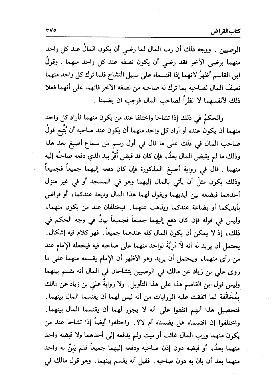 واختلفوا إن اقتسماه هل يضمناه أم لا؟ واختلفوا أيضا إذا تشاحا عند من يكون منهما ورب المال غائب أو ميت ولم يدفعه إلى أحدهما ولا قبضه واحد منهما بعد، أو قبضه دون إذن صاحبه ودفعه إليهما جميعا فلم يبن به واحد منهما بعد أن بان به دون صاحبه. فقيل: إنه يقسم بينهما. وهو قول مالك في