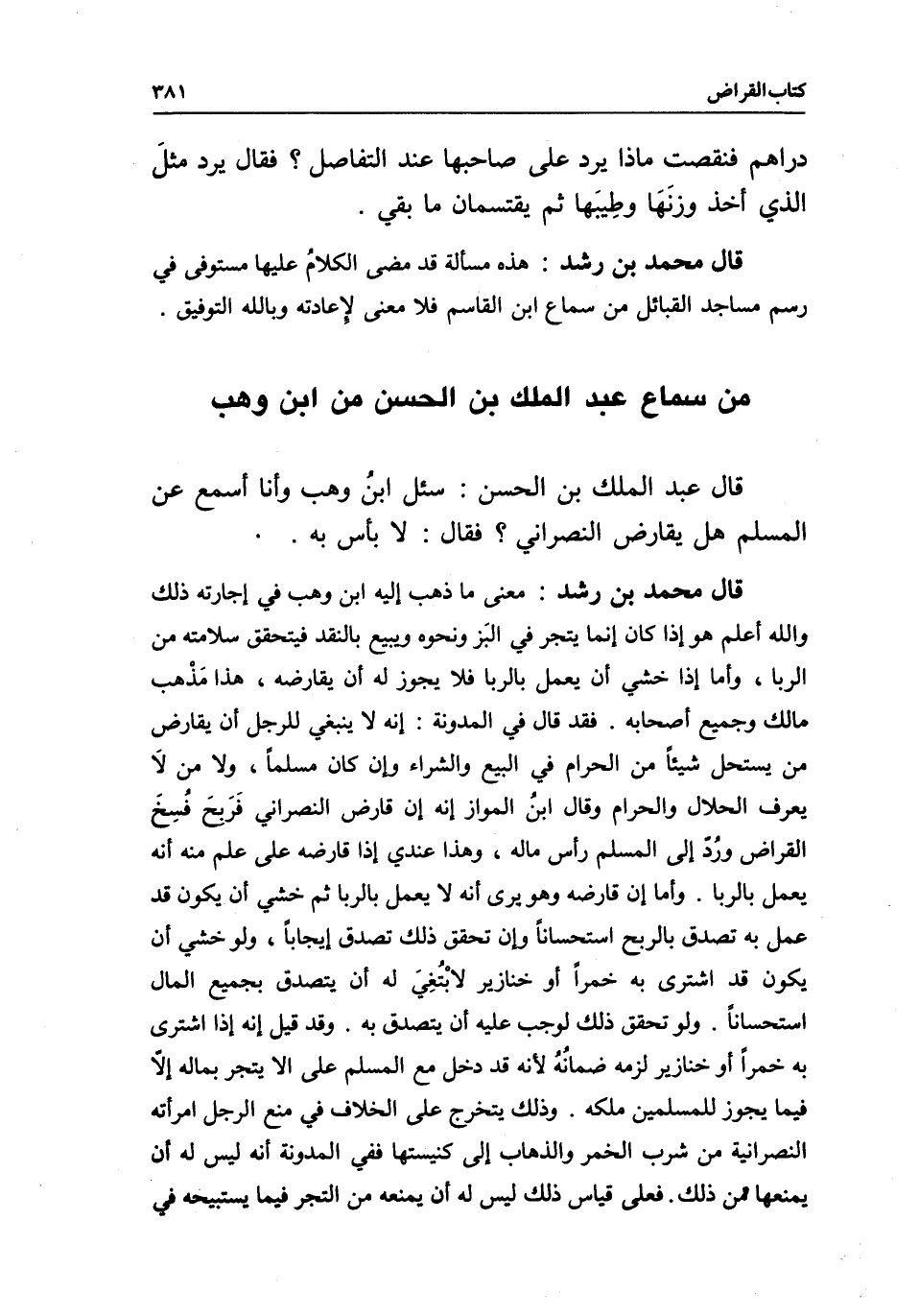 قال محمد بن رشد: معنى ما ذهب إليه ابن وهب في إجازته ذلك والله أعلم هو إذا كان إنما يتجر في البز ونحوه ويبيع بالنقد فيتحقق سلامته من الربا، وأما إذا خشي أن يعمل بالربا فلا يجوز له أن يقارضه، هذا مذهب مالك وجميع أصحابه.