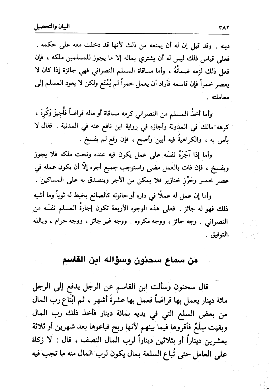 دينه. وقد قيل: إن له أن يمنعه من ذلك؛ لأنها قد دخلت معه على حكمه. فعلى قياس ذلك ليس له أن يشتري بماله إلا ما يجوز للمسلمين ملكه، فإن فعل ذلك لزمه ضمانه، وأما مساقاة المسلم النصراني فهي جائزة إذا كان لا يعصر خمرا، فإن قاسمه فأراد أن يعمل خمرا لم يمنع ولكن لا يعود المسلم إلى معاملته.