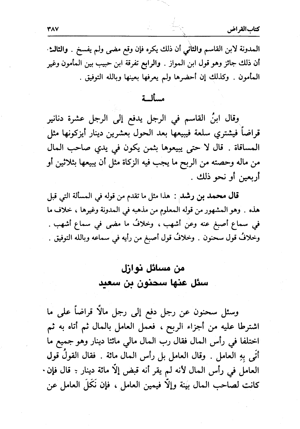 من مسائل نوازل سئل عنها سحنون بن سعيد وسئل سحنون: عن رجل دفع إلى رجل مالا قراضا على ما اشترطا عليه من أجزاء الربح، فعمل العامل بالمال ثم أتاه به ثم اختلفا في رأس المال فقال رب المال: مالي مائتا دينار وهو جميع ما أتَى بِهِ العامل، وقال العامل: بل رأس المال مائة، فقال: القولُ قول العامل في رأس المال؛ لأنه لم يقر أنه قبض إلّا مائة دينار: قال: فإن كانت لصاحب المال بينة وإلّا فيمين العامل، فإن نَكَلَ العامل عن