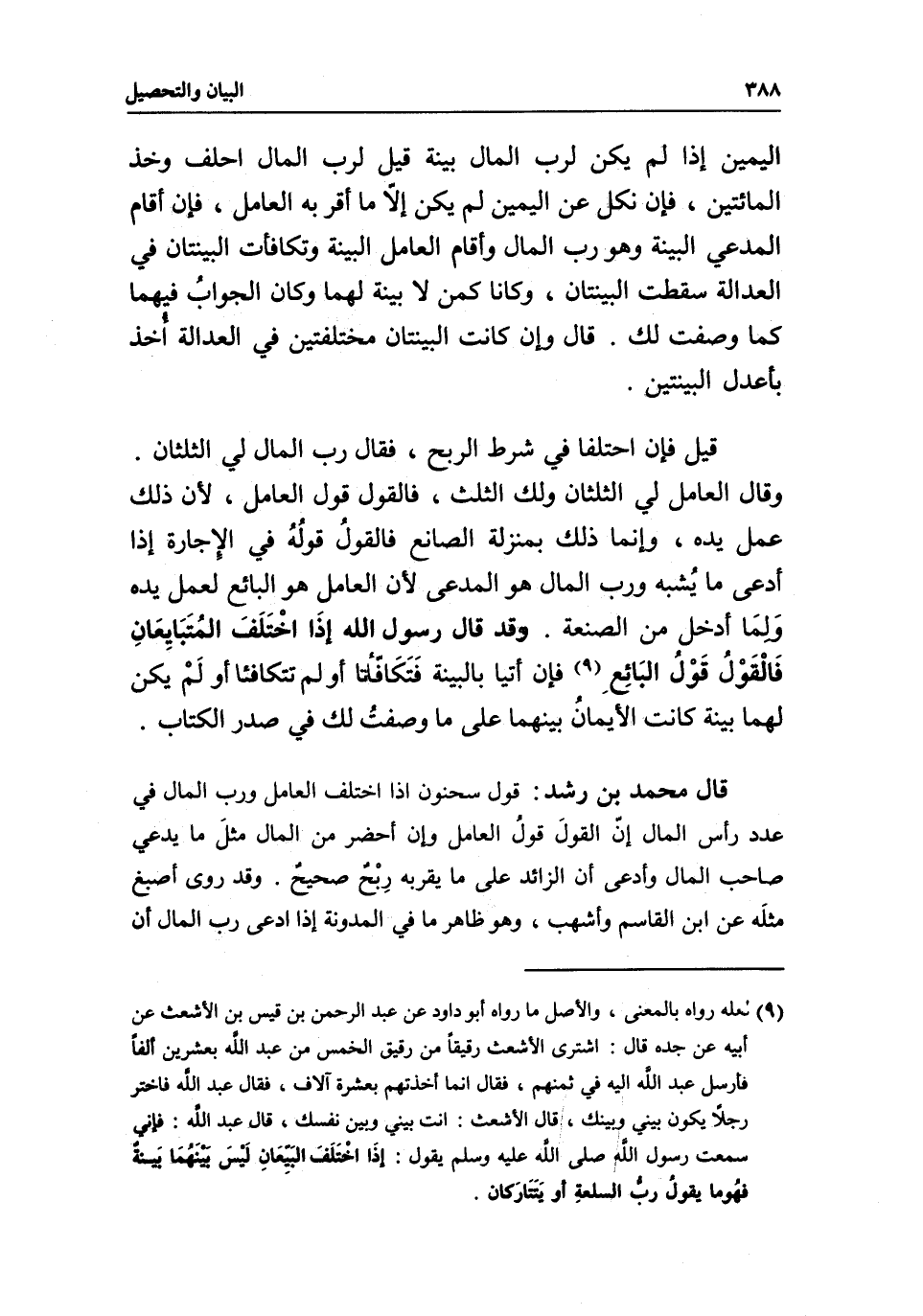 اليمين إذا لم يكن لرب المال بينة قيل لرب المال: احلف وخذ المائتين، فإن نكل عن اليمين لم يكن إلّا ما أقر به العامل، فإن أقام المدعي البينة وهو رب المال، وأقام العامل البينة، وتكافأت البينتان في العدالة سقطت البينتان، وكانا كمن لا بينة لهما، وكان الجوابُ فيهما كما وصفت لك، قال: وإن كانت البينتان مختلفتين في العدالة أُخذ بأعدل البينتين.