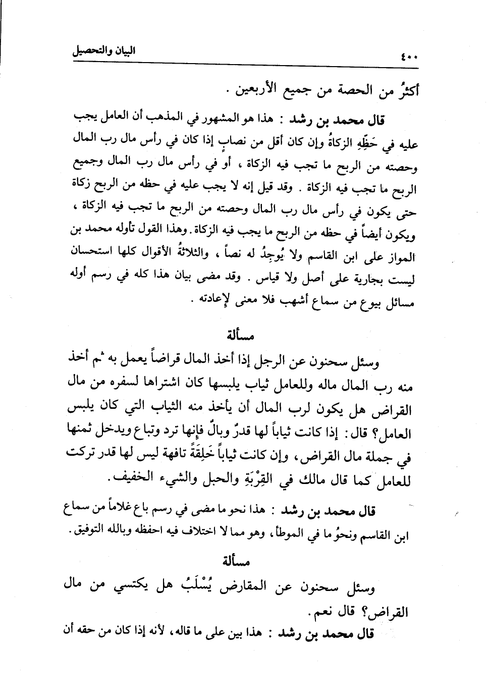 وقد قيل: إنه لا يجب عليه في حظه من الربح زكاة حتى يكون في رأس مال رب المال وحصته من الربح ما تجب فيه الزكاة، ويكون أيضا في حظه من الربح ما يجب فيه الزكاة، وهذا القول تأوله محمد بن المواز على ابن القاسم ولا يُوجدُ له نصا، والثلاثةُ الأقوال كلها استحسان ليست بجارية على أصل ولا قياس، وقد مضى بيان هذا كله في رسم أوله مسائل بيوع من سماع أشهب فلا معنى لإِعادته.