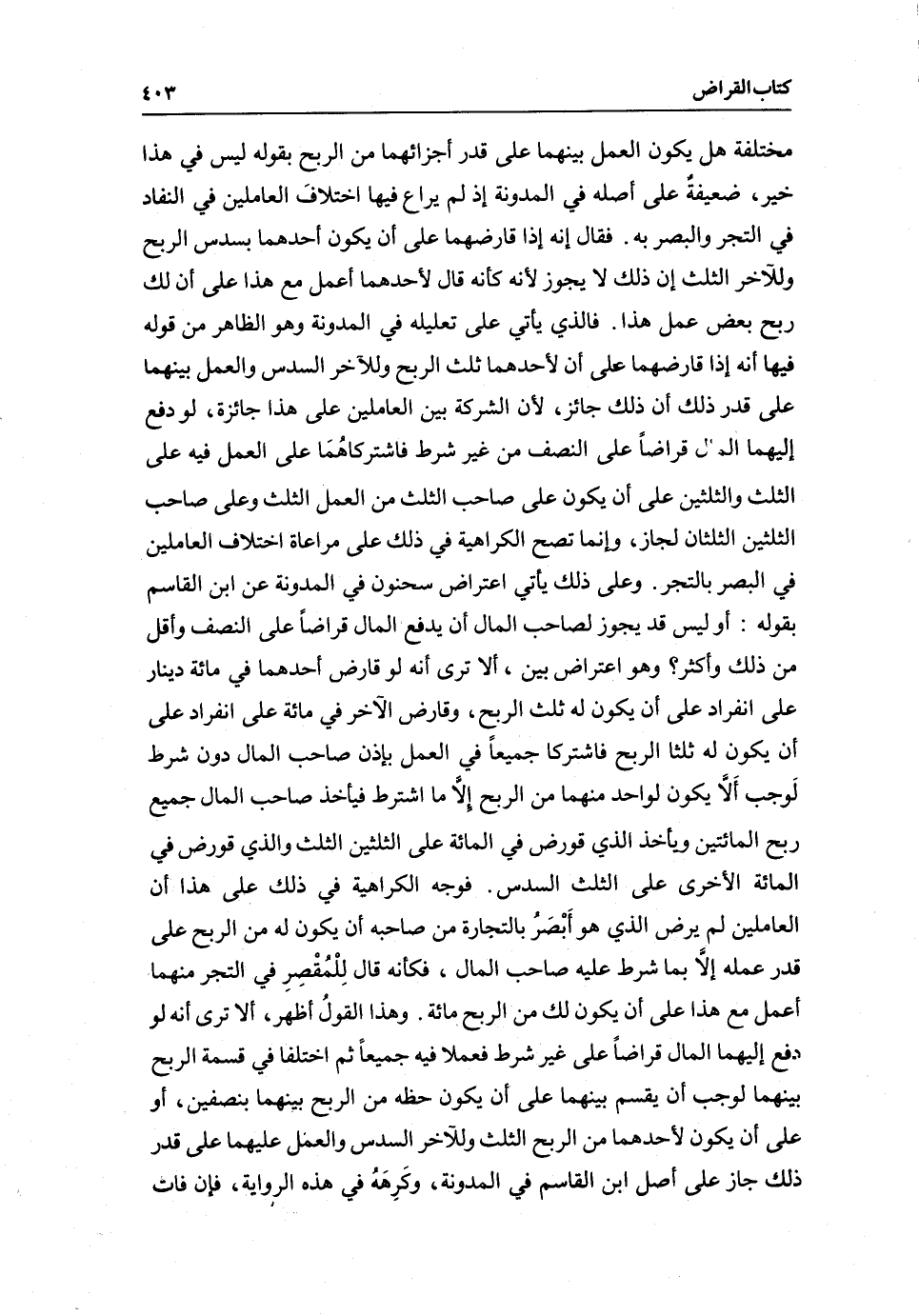 مختلفة هل يكون العمل بينهما على قدر أجزائهما من الربح بقوله: ليس في هذا خير، ضعيفةٌ على أصله في المدونة؛ إذ لم يراع فيها اختلافَ العاملين في النفاد في التجر والبصر به، فقال: إنه إذا قارضهما على أن يكون أحدهما بسدس الربح وللآخر الثلث إن ذلك لا يجوز؛ لأنه كأنه قال لأحدهما: اعمل مع هذا على أن لك ربح بعض عمل هذا، فالذي يأتي على تعليله في المدونة وهو الظاهر من قوله فيها أنه إذا قارضهما على أن لأحدهما ثلث الربح وللآخر السدس والعمل بينهما على قدر ذلك أن ذلك جائز؛ لأن الشركة بين العاملين على هذا جائزة، لو دفع إليهما المال قراضا على النصف من غير شرط فاشتركا همَا على العمل فيه على الثلث والثلثين على أن يكون على صاحب الثلث من العمل الثلث وعلى صاحب الثلثين الثلثان لجاز، وإنما تصح الكراهية في ذلك على مراعاة اختلاف العاملين في البصر بالتجر، وعلى ذلك يأتي اعتراض سحنون في المدونة عن ابن القاسم بقوله: أو ليس قد يجوز لصاحب المال أن يدفع المال قراضا على النصف وأقل من ذلك وأكثر؟ وهو اعتراض بين، ألا ترى أنه لو قارض أحدهما في مائة دينار على انفراد على أن يكون له ثلث الربح، وقارض الآخر في مائة على انفراد على أن يكون له ثلثا الربح فاشتركا جميعا في العمل بإذن صاحب المال دون شرط لَوجب أَلَّا يكون لواحد منهما من الربح إِلاَّ ما اشترط فيأخذ صاحب المال جميع ربح المائتين ويأخذ الذي قورض في المائة على الثلثين الثلث والذي قورض في المائة الأخرى على الثلث السدس.