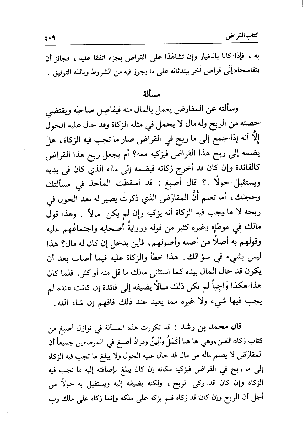 قال محمد بن رشد: قد تكررت هذه المسألة في نوازل أصبغ من كتاب زكاة العين، وهي ها هنا أكْمَلُ وأبينُ، ومرادُ أصبغ في الموضعين جميعا أن المقارَض لا يضم مالَه من مال قد حال عليه الحول ولا يبلغ ما تجب فيه الزكاة إلى ما ربح في القراض فيزكيه مكانه إن كان يبلغ بإضافته إليه ما تجب فيه الزكاة، وإن كان قد زكى الربح، ولكنه يضيفه إليه ويستقبل به حولا من أجل أن الربح وإن كان قد زكاه فلم يزكه على ملكه وإنما زكاه على ملك رب
