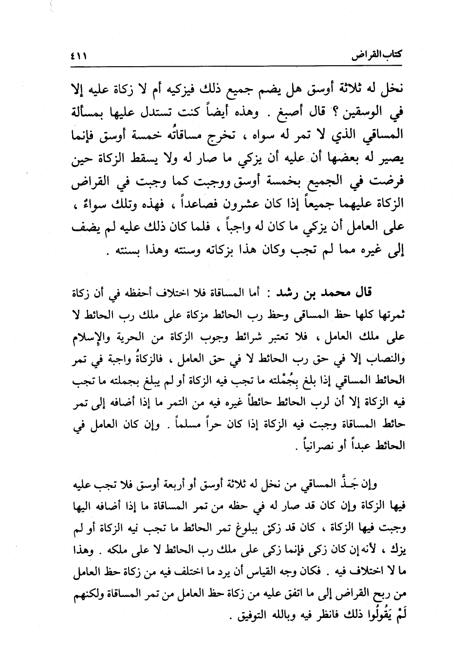 قال محمد بن رشد: أما المساقاة فلا اختلاف أحفظه في أن زكاة ثمرتها كلها حظ المساقي وحظ رب الحائط مزكاة على ملك رب الحائط لا على ملك العامل، فلا تعتبر شرائط وجوب الزكاة من الحرية والِإسلام والنصاب إلا في حق رب الحائط لا في حق العامل، فالزكاةُ واجبة في تمر الحائط المساقي إذا بلغ بِجُمْلته ما تجب فيه الزكاة أو لم يبلغ بجملته ما تجب فيه الزكاة إلا أن لرب الحائط حائطا غيره فيه من التمر ما إذا أضافه إلى تمر حائط المساقاة وجبت فيه الزكاة إذا كان حرا مسلما، وإن كان العامل في الحائط عبدا أو نصرانيا.