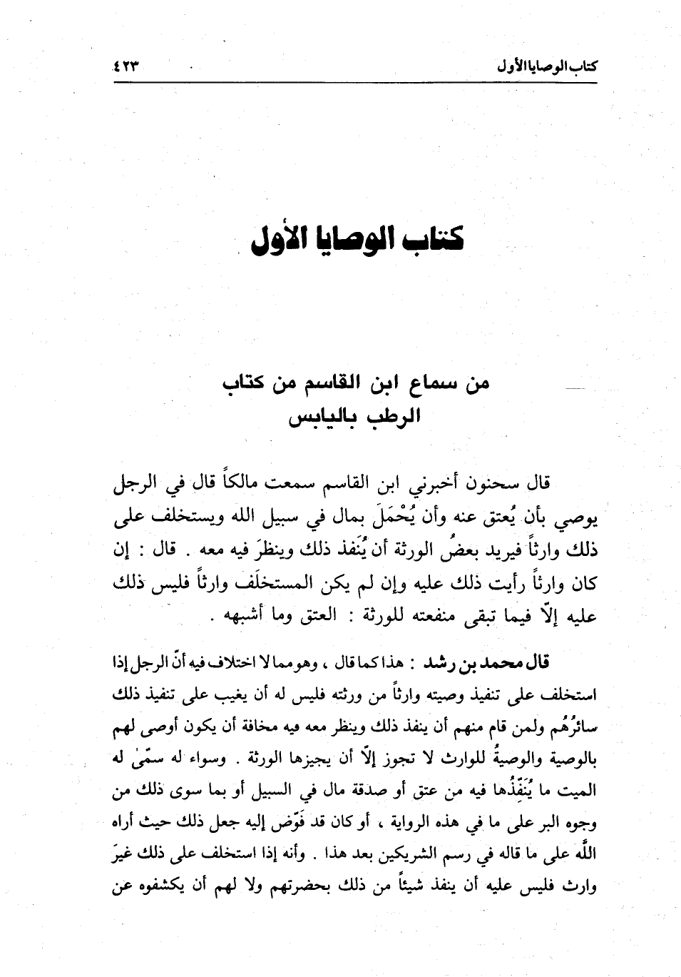 من سماع ابن القاسم من كتاب الرطب باليابس قال سحنون: أخبرني ابن القاسم سمعت مالكا قال في الرجل يوصي بأن يُعتق عنه وأن يُحْمَلَ بمال في سبيل الله ويستخلف على ذلك وارثا فيريد بعضُ الورثة أن يُنَفذ ذلك وينظرَ فيه معه، قال: إن كان وارثا رأيت ذلك عليه، وإن لم يكن المستخلَف وارثا فليس ذلك عليه إلا فيما تبقى منفعته للورثة: العتق وما أشبهه.