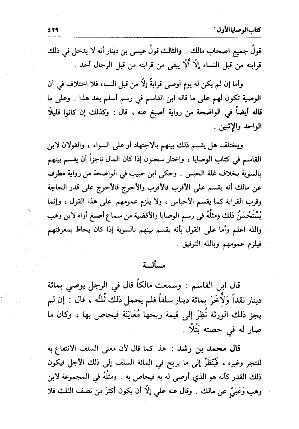 وأما إن لم يكن له يوم أوصى قرابة إلّا من قبل النساء فلا اختلاف في أن الوصية تكون لهم على ما قاله ابن القاسم في رسم أسلم بعد هذا، وعلى ما قال أيضاَ في الواضحة من رواية أصبغ عنه، قال: وكذلك إن كانوا قليَلا الواحد والاِثنين.