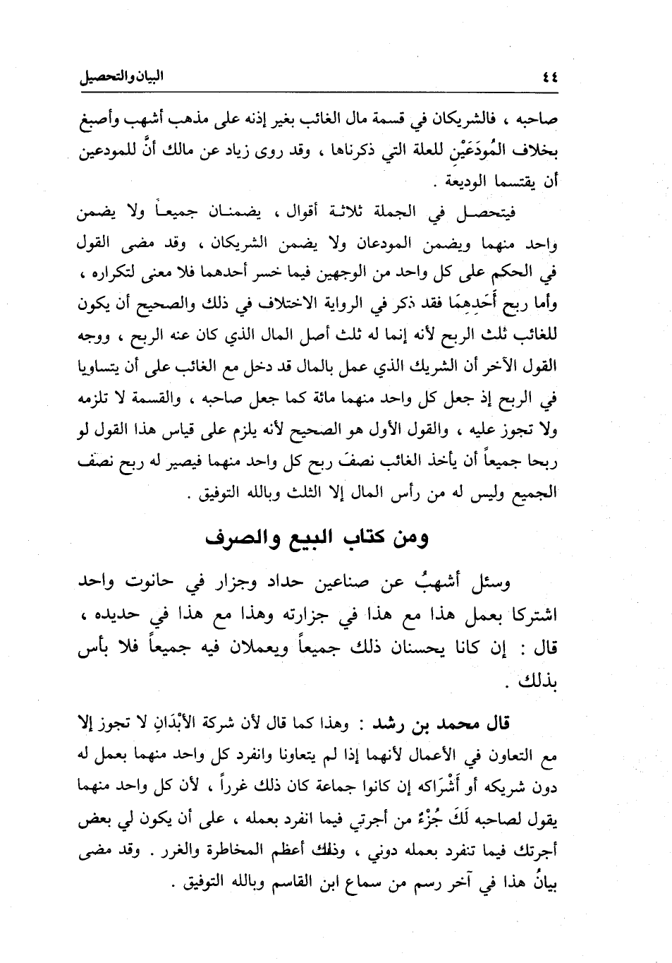 ومن كتاب البيع والصرف وسئل أشهب عن صناعين حداد وجزار في حانوت واحد اشتركا بعمل هذا مع هذا في جزارته وهذا مع هذا في حديده، قال: إن كانا يحسنان ذلك جميعا ويعملان فيه جميعا فلا بأس بذلك.