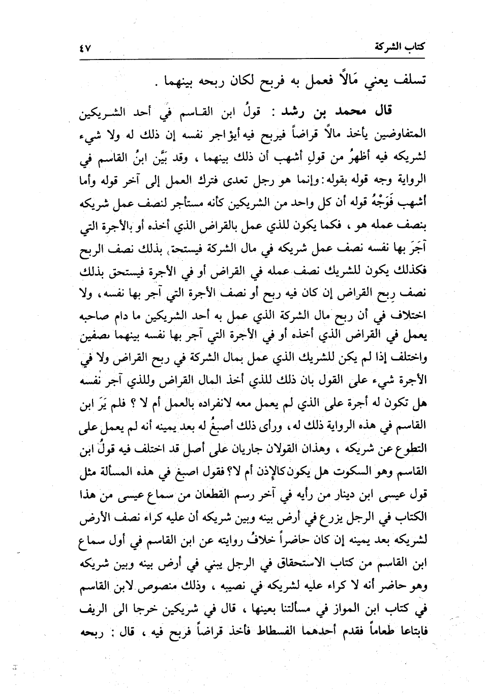قال محمد بن رشد: قول ابن القاسم في أحد الشريكين المتفاوضين يأخذ مالا قراضا فيربح فيه أيؤاجر نفسه إن ذلك له ولا شيء لشريكه فيه أظهر من قولي أشهب أن ذلك بينهما، وقد بين ابن القاسم في الرواية وجه قوله بقوله: وإنما هو رجل تعدى فترك العمل إلى آخر قوله وأما أشهب فوجه قوله أن كل واحد من الشريكين كأنه مستأجر لنصف عمل شريكه بنصف عمله هو، فكما يكون للذي عمل بالقراض الذي أخذه أو بالأجرة التي آجر بها نفسه نصف عمل شريكه في مال الشركة فيستحق، بذلك نصف الربح فكذلك يكون للشريك نصف عمله في القراض أو في الأجرة فيستحق بذلك نصف ربح القراض إن كان فيه ربح أو نصف الأجرة التي آجر بها نفسه، ولا اختلاف في أن ربح مال الشركة الذي عمل به أحد الشريكين ما دام صاحبه يعمل في القراض الذي أخذه أو في الأجرة التي آجر بها نفسه بينهما نصفين واختلف إذا لم يكن للشريك الذي عمل بمال الشركة في ربح القراض ولا في الأجرة شيء على القول بأن ذلك للذي أخذ المال القراض وللذي آجر نفسه هل تكون له أجرة على الذي لم يعمل معه لانفراده بالعمل أم لا؟ فلم ير ابن القاسم في هذه الرواية ذلك له، ورأى ذلك أصبغ له بعد يمينه أنه لم يعمل على التطوع عن شريكه، وهذان القولان جاريان على أصل قد اختلف فيه قول ابن القاسم وهو السكوت هل يكون كالإذن أم لا؟ فقول أصبغ في هذه المسألة مثل قول عيسى بن دينار من رأيه في آخر رسم القطعان من سماع عيسى من هذا الكتاب في الرجل يزرع في أرض بينه وبين شريكه أن عليه كراء نصف الأرض لشريكه بعد يمينه إن كان حاضرا خلاف روايته عن ابن القاسم في أول سماع ابن القاسم من كتاب الاستحقاق في الرجل يبني في أرض بينه وبين شريكه وهو حاضر أنه لا كراء عليه لشريكه في نصيبه، وذلك منصوص لابن القاسم في كتاب ابن المواز في مسألتنا بعينها، قال في شريكين خرجا إلى الريف فابتاعا طعاما فقدم أحدهما الفسطاط فأخذ قراضا فربح فيه، قال: ربحه