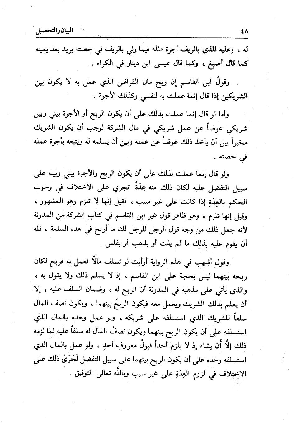 وقول أشهب في هذه الرواية: أرأيت لو تسلف مالا فعمل به فربح لكان ربحه بينهما ليس بحجة على ابن القاسم، إذ لا يسلم ذلك ولا يقول به، والذي يأتي على مذهبه في المدونة أن الربح له، وضمان السلف عليه، إلا أن يعلم بذلك الشريك ويعمل معه فيكون الربح بينهما، ويكون نصف المال سلفا للشريك الذي استسلفه على شريكه، ولو عمل وحده بالمال الذي استسلفه على أن يكون الربح بينهما ويكون نصف المال له سلفا عليه لما لزمه ذلك إلا أن يشاء إذ لا يلزم أحدا قبول معروف أحد، ولو عمل بالمال الذي استسلفه وحده على أن يكون الربح بينهما على سبيل التفضل لجرى ذلك على الاختلاف في لزوم العدة على غير سبب وبالله تعالى التوفيق.