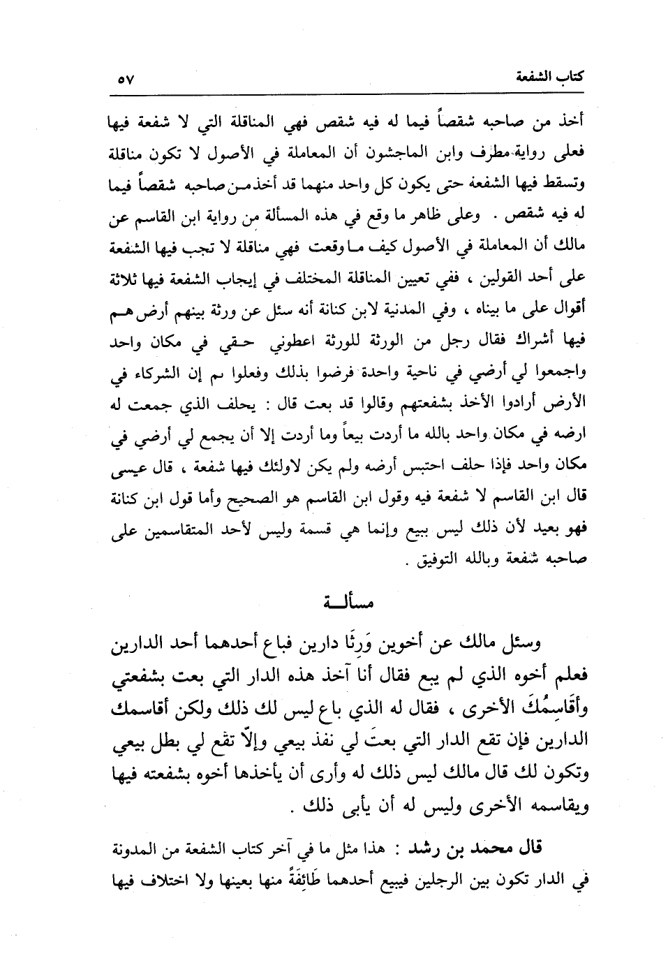 مسألة وسئل مالك عن أخوين ورثا دارين فباع أحدهما أحد الدارين فعلم أخوه الذي لم يبع فقال: أنا آخذ هذه الدار التي بعت بشفعتي وأقاسمك الأخرى، فقال له الذي باع: ليس لك ذلك ولكن أقاسمك الدارين فإن تقع الدار التي بعت لي نفذ بيعي وإلا تقع لي بطل بيعي وتكون لك قال مالك: ليس ذلك له وأرى أن يأخذها أخوه بشفعته فيها ويقاسمه الأخرى وليس له أن يأبى ذلك.