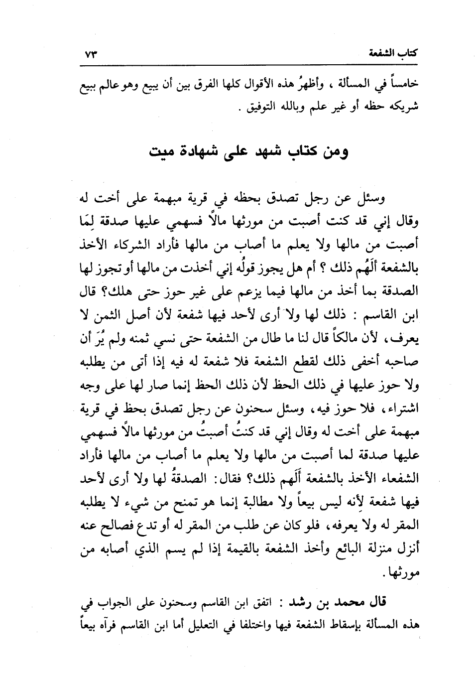 قال محمد بن رشد: اتفق ابن القاسم وسحنون على الجواب في هذه المسألة بإسقاط الشفعة فيها واختلفا في التعليل أما ابن القاسم فرآه بيعا