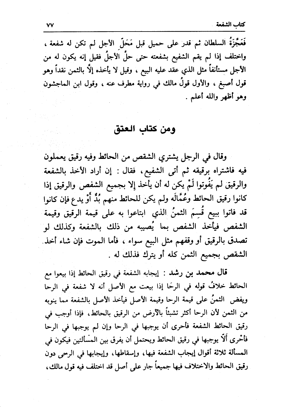 قال محمد بن رشد: إيجابه الشفعة في رقيق الحائط إذا بيعوا مع الحائط خلاف قوله في الرحا إذا بيعت مع الأصل أنه لا شفعة في الرحا ويفض الثمن على قيمة الرحا وقيمة الأصل فيأخذ الأصل بالشفعة مما ينوبه من الثمن لأن الرحا أكثر تشبثا بالأرض من الرقيق بالحائط، فإذا أوجب في رقيق الحائط. الشفعة فأحرى أن يوجبها في الرحا وإن لم يوجبها في الرحا فأحرى ألا يوجبها في رقيق الحائط ويحتمل أن يفرق بين المسألتين فيكون في المسألة ثلاثة أقوال: إيجاب الشفعة فيها، وإسقاطها، وإيجابها في الرحى دون رقيق الحائط والاختلاف فيها جميعا جار على أصل قد اختلف فيه قول مالك،