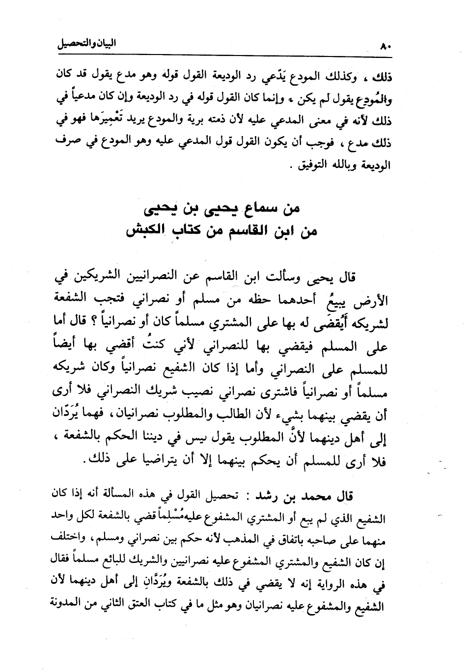 قال محمد بن رشد: تحصيل القول في هذه المسألة أنه إذا كان الشفيع الذي لم يبع أو المشتري المشفوع عليه مسلما قضى بالشفعة لكل واحد منهما على صاحبه باتفاق في المذهب؛ لأنه حكم بين نصراني ومسلم، واختلف إن كان الشفيع والمشتري المشفوع عليه نصرانيين والشريك للبائع مسلما فقال في هذه الرواية: إنه لا يقضي في ذلك بالشفعة ويردان إلى أهل دينهما لأن الشفيع والمشفوع عليه نصرانيان وهو مثل ما في كتاب العتق الثاني من المدونة