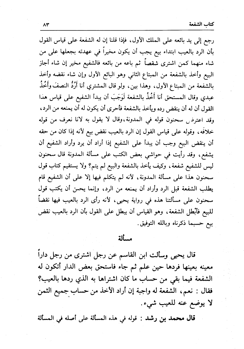 مسألة قال يحيى: وسألت ابن القاسم عن رجل اشترى من رجل دارا معينة بعينها فردها حين علم ثم جاء فاستحق بعض الدار أتكون له الشفعة فيما بقي من حساب ما كان اشتراها به الذي ردها بالعيب؟ فقال: نعم، الشفعة له واجبة إن أراد الأخذ من حساب جميع الثمن لا يوضع عنه للعيب شيء.