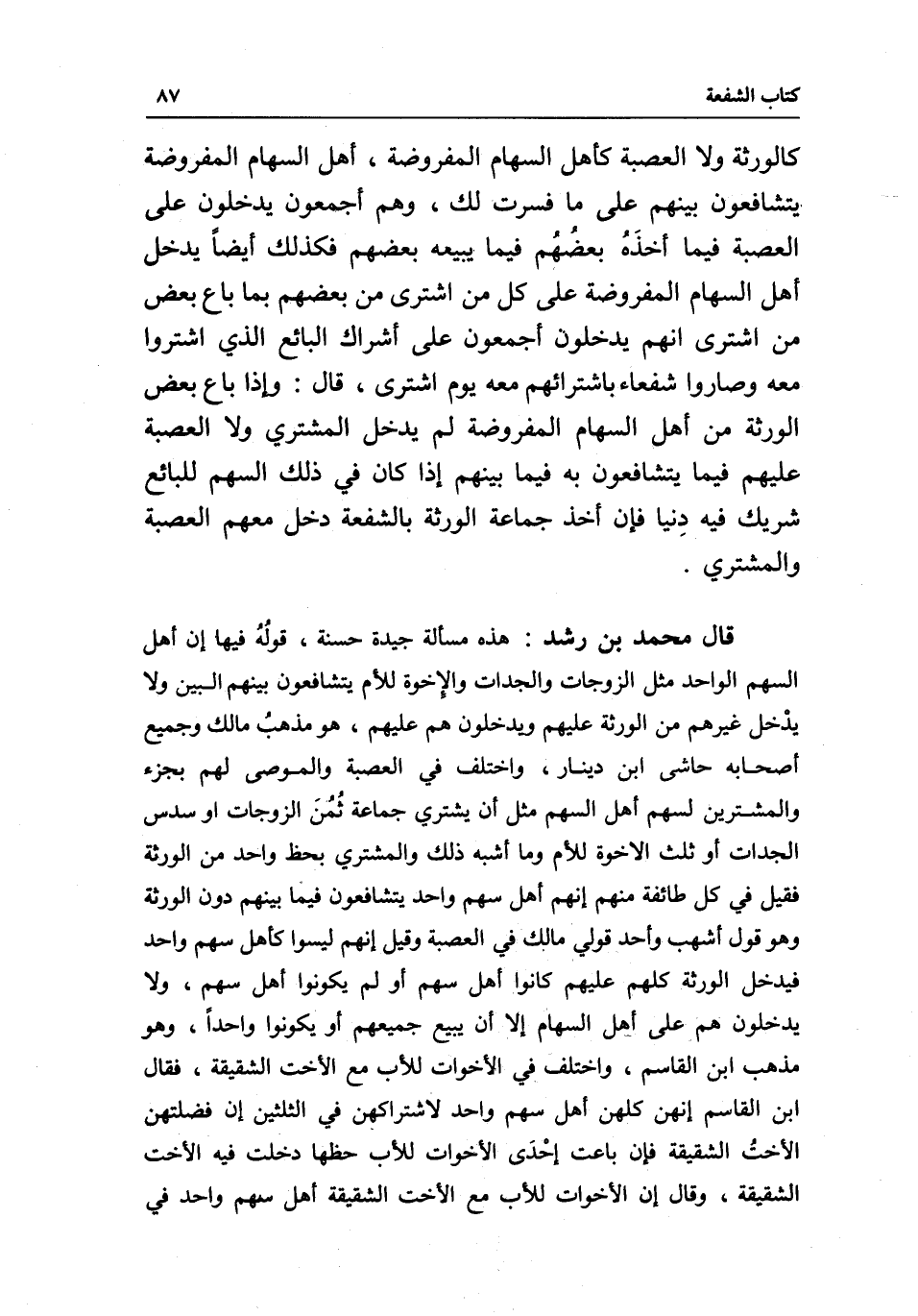 قال محمد بن رشد: هذه مسألة جيدة حسنة، قوله فيها: إن أهل السهم الواحد مثل الزوجات والجدات والإخوة للأم يتشافعون بينهم البين ولا يدخل غيرهم من الورثة عليهم ويدخلون هم عليهم، هو مذهب مالك وجميع أصحابه حاشى ابن دينار، واختلف في العصبة والموصى لهم بجزء والمشترين لسهم أهل السهم مثل أن يشتري جماعة ثمن الزوجات أو سدس الجدات أو ثلث الأخوة للأم وما أشبه ذلك والمشتري بحظ واحد من الورثة فقيل في كل طائفة منهم: إنهم أهل سهم واحد يتشافعون فيما بينهم دون الورثة وهو قول أشهب وأحد قولي مالك في العصبة وقيل: إنهم ليسوا كأهل سهم واحد فيدخل الورثة كلهم عليهم كانوا أهل سهم أو لم يكونوا أهل سهم، ولا يدخلون هم على أهل السهام إلا أن يبيع جميعهم أو يكونوا واحدا، وهو مذهب ابن القاسم، واختلف في الأخوات للأب مع الأخت الشقيقة، فقال ابن القاسم: إنهن كلهن أهل سهم واحد لاشتراكهن في الثلثين إن فضلتهن الأخت الشقيقة فإن باعت إحدى الأخوات للأب حظها دخلت فيه الأخت الشقيقة، وقال: إن الأخوات للأب مع الأخت الشقيقة أهل سهم واحد في