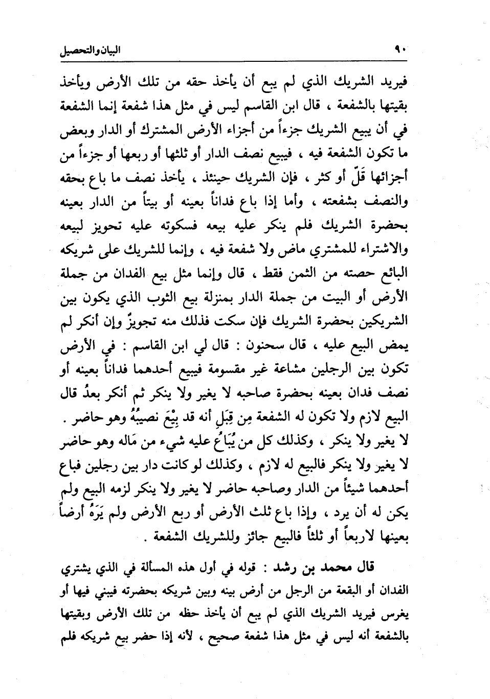 قال محمد بن رشد: قوله في أول هذه المسألة في الذي يشتري الفدان أو البقعة من الرجل من أرض بينه وبين شريكه بحضرته فيبني فيها أو يغرس فيريد الشريك الذي لم يبع أن يأخذ حظه من تلك الأرض وبقيتها بالشفعة أنه ليس في مثل هذا شفعة صحيح؛ لأنه إذا حضر بيع شريكه فلم