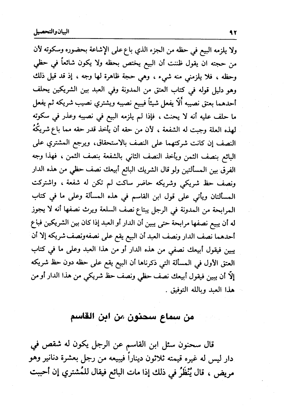 ولا يلزمه البيع في حظه من الجزء الذي باع على الإشاعة بحضوره وسكوته لأن من حجته أن يقول: ظننت أن البيع يختص بحظه ولا يكون شائعا في حظي وحظه، فلا يلزمني منه شيء، وهي حجة ظاهرة لها وجه، إذ قد قيل ذلك وهو دليل قوله في كتاب العتق من المدونة وفي العبد بين الشريكين يحلف أحدهما بعتق نصيبه ألا يفعل شيئا فيبيع نصيبه ويشتري نصيب شريكه ثم يفعل ما حلف عليه أنه لا يحنث، فإذا لم يلزمه البيع في نصيبه وعذر في سكوته لهذه العلة وجبت له الشفعة؛ لأن من حقه أن يأخذ قدر حقه مما باع شريكة النصف إن كانت شركتهما على النصف بالاستحقاق، ويرجع المشتري على البائع بنصف الثمن يأخذ النصف الثاني بالشفعة بنصف الثمن، فهذا وجه الفرق بين المسألتين ولو قال الشريك البائع: أبيعك نصف حظي من هذه الدار ونصف حظ شريكي وشريكه حاضر ساكت لم تكن له شفعة، واشتركت المسألتان ويأتي على قول ابن القاسم في هذه المسألة وعلى ما في كتاب المرابحة من المدونة في الرجل يبتاع نصف السلعة ويرث نصفها أنه لا يجوز له أن يبيع نصفها مرابحة حتى يبين أن الدار أو العبد إذا كان بين الشريكين فباع أحدهما نصف الدار ونصف العبد أن البيع يقع على نصفه ونصف شريكه إلا أن يبين فيقول: أبيعك نصفي من هذه الدار أو من هذا العبد وعلى ما في كتاب العتق الأول في المسألة التي ذكرناها أن البيع يقع على حظه دون حظ شريكه إلا أن يبين فيقول: أبيعك نصف حظي ونصف حظ شريكي من هذا الدار أو من هذا العبد وبالله التوفيق.