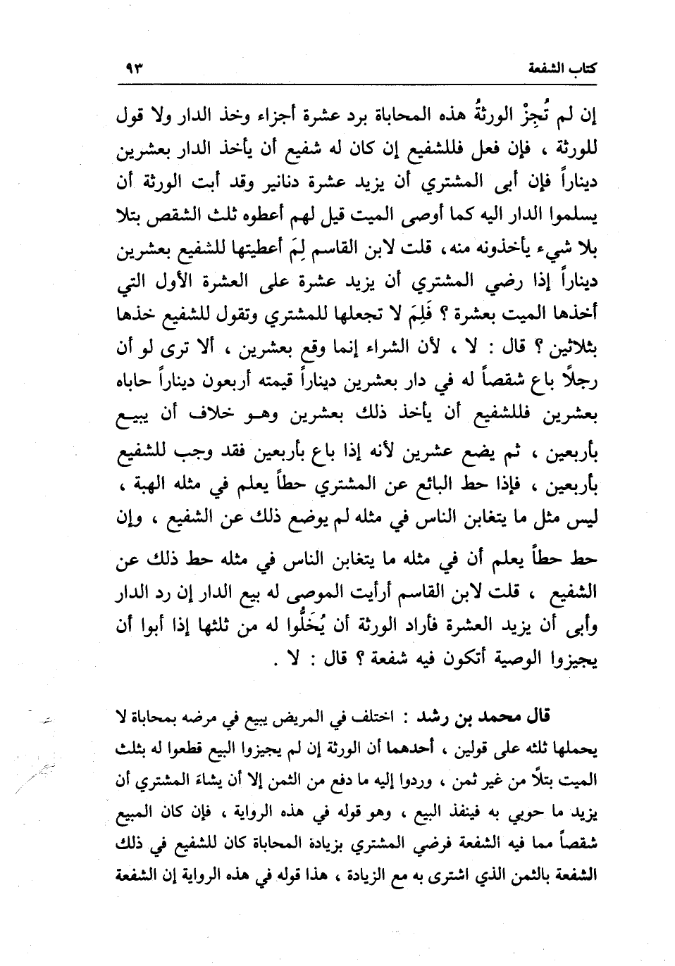 إن لم تجز الورثة هذه المحاباة برد عشرة أجزاء وخذ الدار ولا قول للورثة، فإن فعل فللشفيع إن كان له شفيع أن يأخذ الدار بعشرين دينارا فإن أبى المشتري أن يزيد عشرة دنانير وقد أبت الورثة أن يسلموا الدار إليه كما أوصى الميت قيل لهم: أعطوه ثلث الشقص بتلا بلا شيء يأخذونه منه، قلت لابن القاسم: لم أعطيتها للشفيع بعشرين دينارا إذا رضي المشتري أن يزيد عشرة على العشرة الأول التي أخذها الميت بعشرة؟ فلم لا تجعلها للمشتري وتقول للشفيع خذها بثلاثين؟ قال: لا؛ لأن الشراء إنما وقع بعشرين، ألا ترى لو أن رجلا باع شقصا له في دار بعشرين دينارا قيمته أربعون دينارا حاباه بعشرين فللشفيع أن يأخذ ذلك بعشرين وهو خلاف أن يبيع بأربعين، ثم يضع عشرين لأنه إذا باع بأربعين فقد وجب للشفيع بأربعين، فإذا حط البائع عن المشتري حطا يعلم في مثله الهبة، ليس مثل ما يتغابن الناس في مثله لم يوضع ذلك عن الشفيع، وإن حط حطا يعلم أن في مثله ما يتغابن الناس في مثله حط ذلك عن الشفيع، قلت لابن القاسم: أرأيت الموصى له بيع الدار إن رد الدار وأبى أن يزيد العشرة فأراد الورثة أن يخلوا له من ثلثها إذا أبوا أن يجيزوا الوصية أتكون فيه شفعة؟ قال: لا.