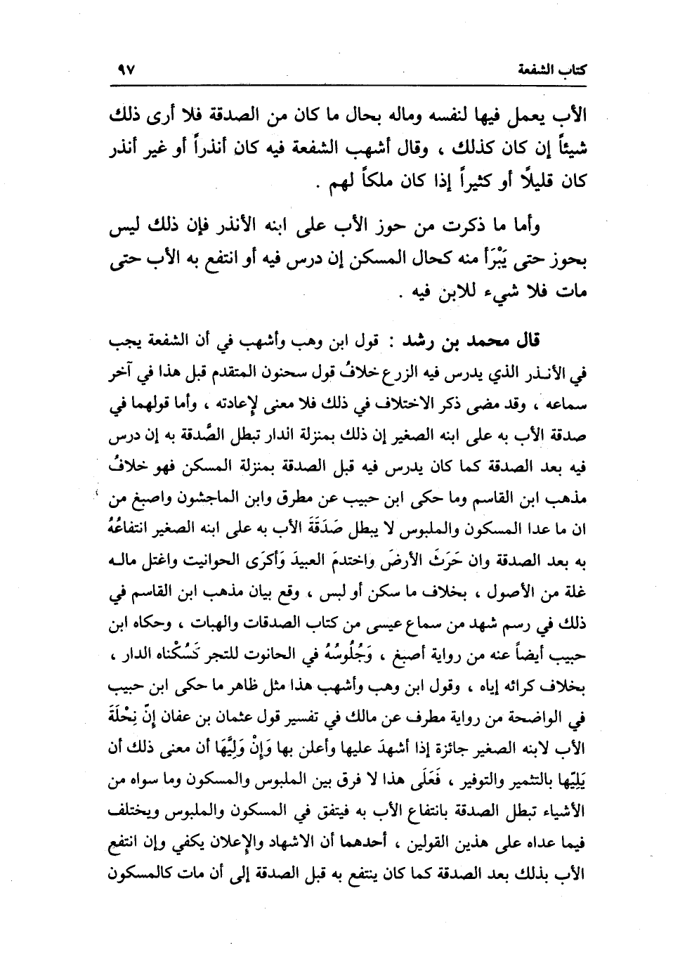 قال محمد بن رشد: قول ابن وهب وأشهب في أن الشفعة يجب في الأنذر الذي يدرس فيه الزرع خلاف قول سحنون المتقدم قبل هذا في آخر سماعه، وقد مضى ذكر الاختلاف في ذلك فلا معنى لإعادته، وأما قولهما في صدقة الأب به على ابنه الصغير إن ذلك بمنزلة الدار تبطل الصدقة به إن درس فيه بعد الصدقة كما كان يدرس فيه قبل الصدقة بمنزلة المسكن فهو خلاف مذهب ابن القاسم وما حكى ابن حبيب عن مطرف وابن الماجشون وأصبغ من أن ما عدا المسكون والملبوس لا يبطل صدقة الأب به على ابنه الصغير انتفاعه به بعد الصدقة وإن حرث الأرض واختدم العبيد وأكرى الحوانيت واغتل ماله غلة من الأصول، بخلاف ما سكن أو لبس، وقع بيان مذهب ابن القاسم في ذلك في رسم شهد من سماع عيسى من كتاب الصدقات والهبات، وحكاه ابن حبيب أيضا عنه من رواية أصبغ، جلوسه في الحانوت للتجر كسكناه الدار، بخلاف كرائه إياه، وقول ابن وهب وأشهب هذا مثل ظاهر ما حكى ابن حبيب في الواضحة من رواية مطرف عن مالك في تفسير قول عثمان بن عفان إن نحلة الأب لابنه الصغير جائزة إذا أشهد عليها وأعلن بها وإن وليها أن معنى ذلك أن يليها بالتثمير والتوفير، فعلى هذا لا فرق بين الملبوس والمسكون وما سواه من الأشياء تبطل الصدقة بانتفاع الأب به فيتفق في المسكون والملبوس ويختلف فيما عداه على هذين القولين، أحدهما أن الإشهاد والإعلان يكفي وإن انتفع الأب بذلك بعد الصدقة كما كان ينتفع به قبل الصدقة إلى أن مات كالمسكون