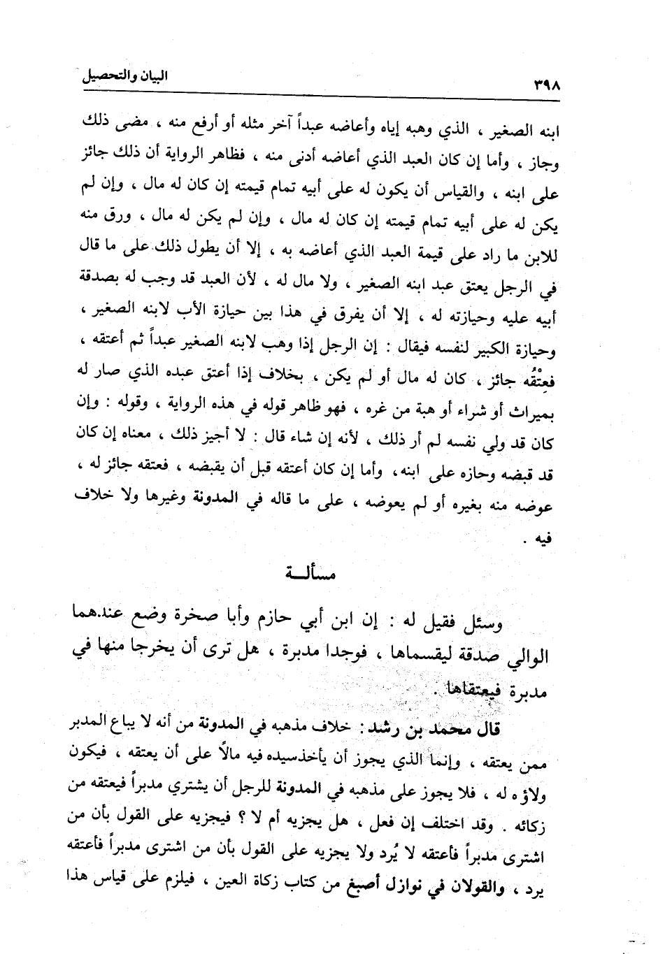 قال محمد بن رشد: خلاف مذهبه في المدونة من أنه لا يباع المدبر ممن يعتقه، وإنما الذي يجوز أن يأخذ سيده فيه مالا على أن يعتقه، فيكون ولاؤه له، فلا يجوز على مذهبه في المدونة للرجل أن يشتري مدبرا فيعتقه من زكاته، وقد اختلف إن فعل، هل يجزيه أم لا؟ فيجزيه على القول بأن من اشترى مدبرا فأعتقه لا يرد ولا يجزيه، على القول بأن من اشترى مدبرا فأعتقه يرد، والقولان في نوازل أصبغ من كتاب زكاة العين، فيلزم على قياس هذا