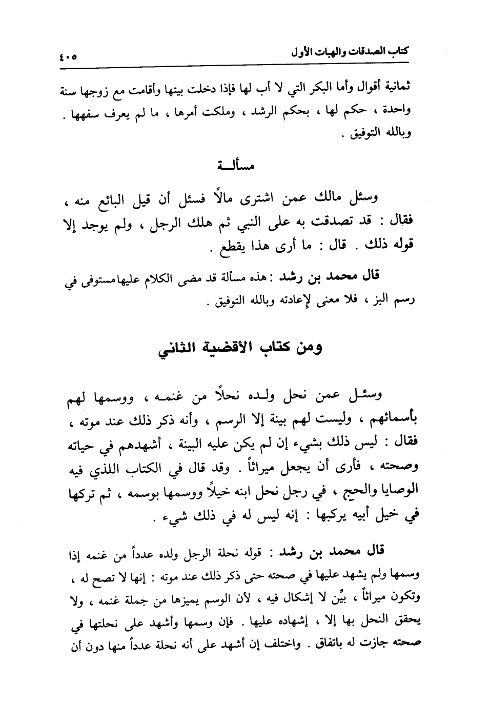 ومن كتاب الأقضية الثاني وسئل: عمن نحل ولده نحلا من غنمه، ووسمها لهم بأسمائهم، وليست لهم بينة إلا الرسم، وأنه ذكر ذلك عند موته، فقال: ليس ذلك بشيء إن لم يكن عليه البينة؛ أشهدهم في حياته وصحته، فأرى أن يجعل ميراثا. وقد قال في الكتاب الذي فيه الوصايا والحج، في رجل نحل ابنه خيلا ووسمها بوسمه، ثم تركها في خيل أبيه يركبها: إنه ليس له في ذلك شيء.