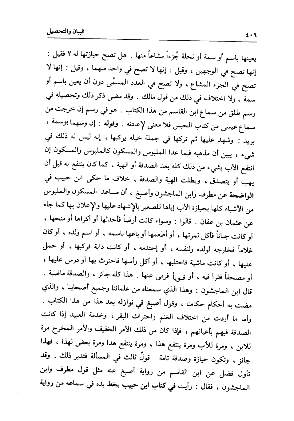يعينها باسم أو سمة أو نحلة جزءا مشاعا منها، هل تصح حيازتها له؟ فقيل: إنها تصح في الوجهين، وقيل: إنها لا تصح في واحد منهما، وقيل: إنها لا تصح في الجزء المشاع، ولا تصح في العدد المسمى دون أن يعين باسم أو سمة، ولا اختلاف في ذلك من قول مالك. وقد مضى ذكر ذلك وتحصيله في رسم طلق من سماع ابن القاسم من هذا الكتاب. هو في رسم إن خرجت من سماع عيسى من كتاب الحبس فلا معنى لإعادته.