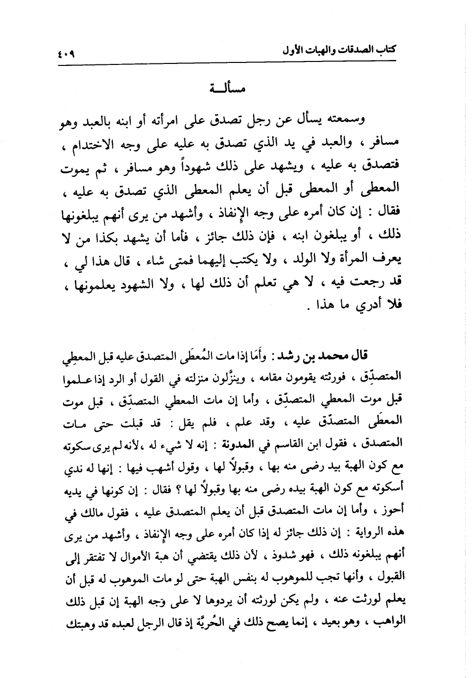 قال محمد بن رشد: وأما إذا مات المعطى المتصدق عليه قبل المعطي المتصدق، فورثته يقومون مقامه، وينزلون منزلته في القول أو الرد إذا علموا قبل موت المعطي المتصدق، وأما إن مات المعطي المتصدق، قبل موت المعطى المتصدق عليه، وقد علم، فلم يقل: قد قبلت حتى مات المتصدق، فقول ابن القاسم في المدونة: إنه لا شيء له؛ لأنه لم يرى سكوته مع كون الهبة بيد رضا منه بها، وقبولا لها، وقول أشهب فيها: إنها له ندي أسكوته مع كون الهبة بيده رضا منه بها وقبولا لها؟ فقال: إن كونها في يديه أحوز، وأما إن مات المتصدق قبل أن يعلم المتصدق عليه، فقول مالك في هذه الرواية: إن ذلك جائز له إذا كان أمره على وجه الإنفاذ، وأشهد من يرى أنهم يبلغونه ذلك، فهو شذوذ؛ لأن ذلك يقتضي أن هبة الأموال لا تفتقر إلى القبول، وأنها تجب للموهوب له بنفس الهبة حتى لو مات الموهوب له قبل أن يعلم لورثت عنه، ولم يكن لورثته أن يردوها لا على وجه الهبة إن قبل ذلك الواهب، وهو بعيد، إنما يصح ذلك في الحرية إذا قال الرجل لعبده قد وهبتك