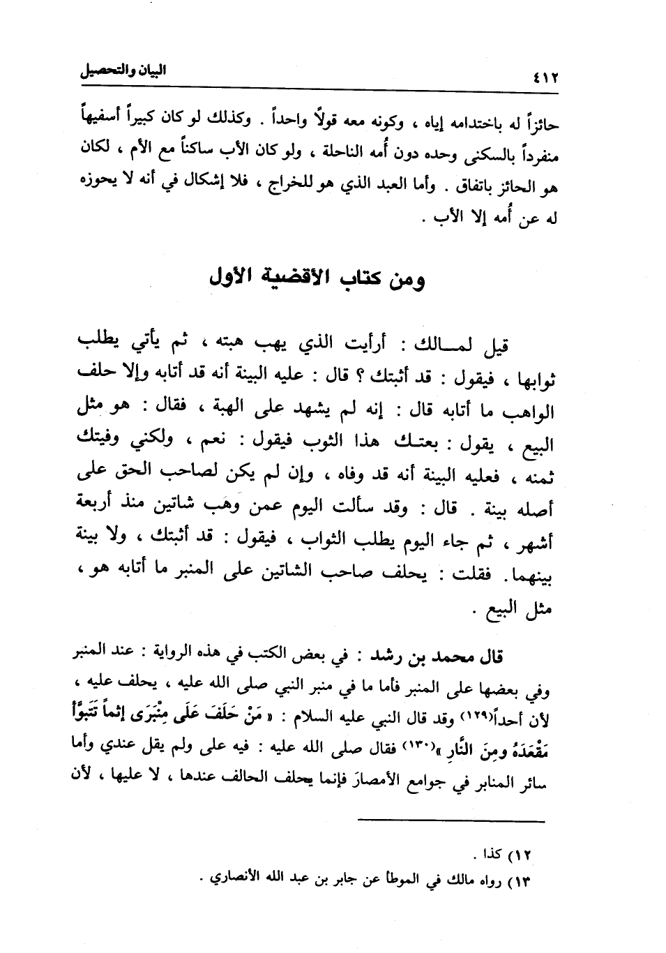 قال محمد بن رشد: في بعض الكتب في هذه الرواية: عند المنبر، وفي بعضها: على المنبر. فأما ما في منبر النبي - صَلَّى اللَّهُ عَلَيْهِ وَسَلَّمَ -، يحلف عليه؛ لأن أحدا ... وقد قال النبي - عَلَيْهِ السَّلَامُ -: «من حلف على منبري إثما تَبَوَّأَ مقعده من النار» فقال - صَلَّى اللَّهُ عَلَيْهِ وَسَلَّمَ - فيه: على، ولم يقل: عندي. وأما سائر المنابر في جوامع الأمصار فإنما يحلف الحالف عندها، لا عليها؛ لأن