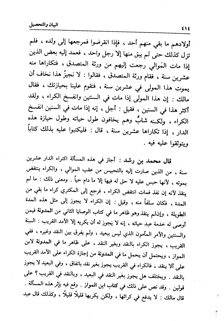 قال محمد بن رشد: أجاز في هذه المسألة اكتراء الدار عشرين سنة، من الذين صارت إليه بالتحبيس من عقب الموالي، والكراء ينتقض بموته؛ لأنها حبس عليه لا حق له فيها إلا ما دام حيا.