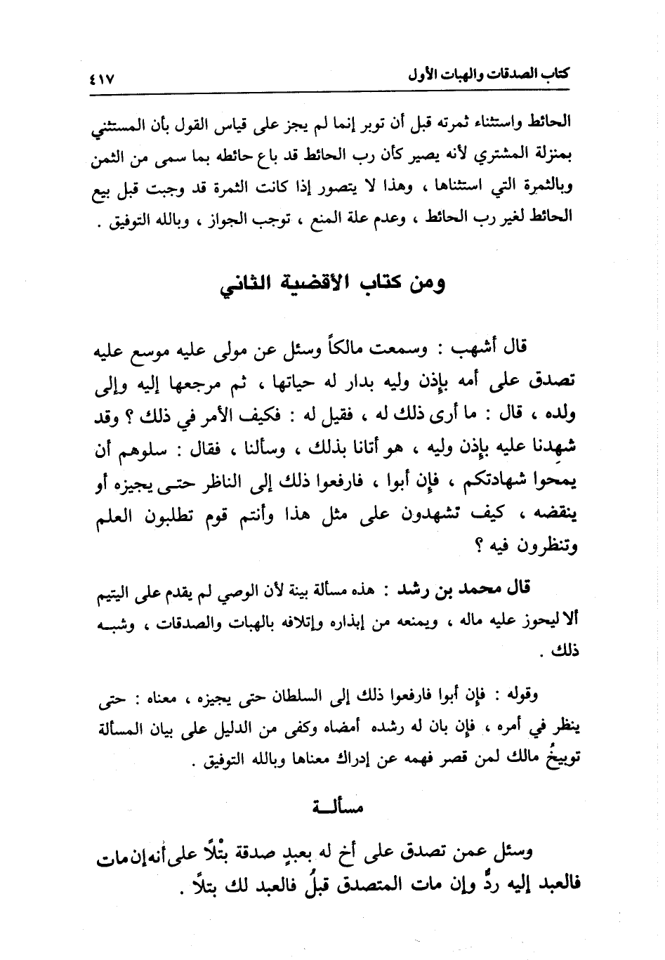 ومن كتاب الأقضية الثاني قال أشهب: وسمعت مالكا، وسئل: عن مولى عليه موسع عليه تصدق على أمه بإذن وليه بدار له حياتها، ثم مرجعها إليه وإلى ولده، قال: ما أرى ذلك له، فقيل له: فكيف الأمر في ذلك؟ وقد شهدنا عليه بإذن وليه، هو أتانا بذلك، وسألنا، فقال: سلوهم أن يمحوا شهادتكم، فإن أبوا، فارفعوا ذلك إلى الناظر حتى يجيزه أو ينقضه، كيف تشهدون على مثل هذا وأنتم قوم تطلبون العلم وتنظرون فيه؟