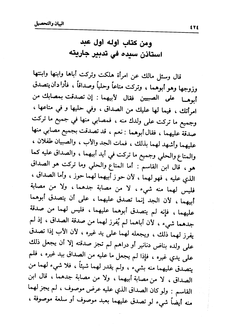 ومن كتاب أوله أول عبد استأذن سيده في تدبير جاريته قال: وسئل مالك: عن امرأة هلكت وتركت أباها وابنها وابنتها وزوجها وهو أبوهما، وتركت متاعا وحليا وصداقا، فأراد أن يتصدق أبوها على الصبيين، فقال لأبيهما: إن تصدقت بمصابك من امرأتك، فيما لها عليك من الصداق، وفي حليها وفي متاعها، وجميع ما تركت على ولدك منه، فمصابي منها في جميع ما تركت صدقة عليهما، فقال أبوهما: نعم، قد تصدقت بجميع مصابي منها عليهما وأشهد لهما بذلك، فمات الجد والأب، والصبيان طفلان، والمتاع والحلي وجميع ما تركت في أيد أبيهما، والصداق عليه كما هو.