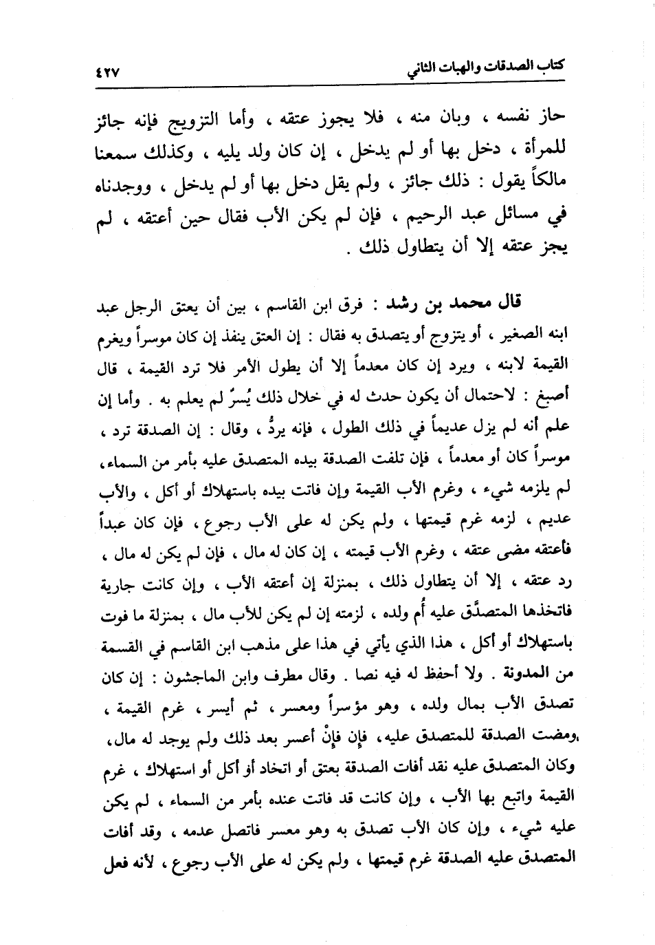 قال محمد بن رشد: فرق ابن القاسم بين أن يعتق الرجل عبد ابنه الصغير، أو يتزوج أو يتصدق به، فقال: إن العتق ينفذ إن كان موسرا ويغرم القيمة لابنه، ويرد إن كان معدما إلا أن يطول الأمر فلا ترد القيمة، قال أصبغ: لاحتمال أن يكون حدث له في خلال ذلك يسر لم يعلم به. وأما إن علم أنه لم يزل عديما في ذلك الطول، فإنه يرد، وقال: إن الصدقة ترد، موسرا كان أو معدما، فإن تلفت الصدقة بيده المتصدق عليه بأمر من السماء، لم يلزمه شيء، وغرم الأب القيمة وإن فاتت بيده باستهلاك أو أكل، والأب عديم، لزمه غرم قيمتها، ولم يكن له على الأب رجوع، فإن كان عبدا فأعتقه مضى عتقه، وغرم الأب قيمته، إن كان له مال، فإن لم يكن له مال، رد عتقه، إلا أن يتطاول ذلك، بمنزلة إن أعتقه الأب، وإن كانت جارية فاتخذها المتصدق عليه أم ولده، لزمته إن لم يكن للأب مال، بمنزلة ما فوت باستهلاك أو أكل، هذا الذي يأتي في هذا على مذهب ابن القاسم في القسمة من المدونة. ولا أحفظ له فيه نصا.