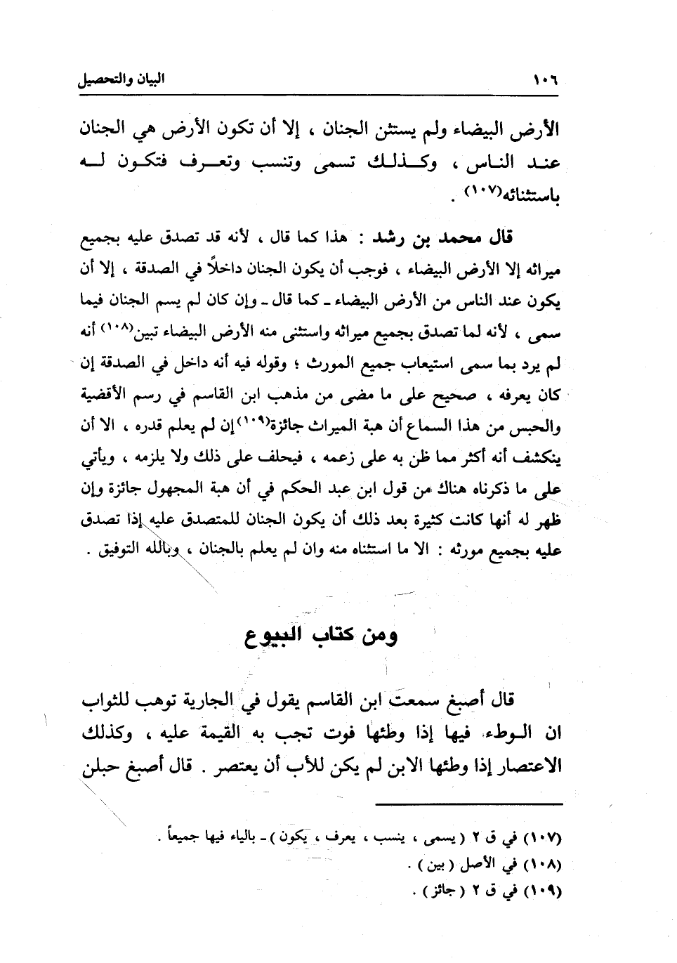 قال محمد بن رشد: هذا كما قال؛ لأنه قد تصدق عليه بجميع ميراثه إلا الأرض البيضاء، فوجب أن يكون الجنان داخلا في الصدقة، إلا أن يكون عند الناس من الأرض البيضاء كما قال، وإن كان لم يسم الجنان فيما سمى؛ لأنه لما تصدق بجميع ميراثه، واستثنى منه الأرض البيضاء تبين أنه لم يرد بما سمى استيعاب جميع المورث؛ وقوله فيه أنه داخل في الصدقة إن كان يعرفه، صحيح على ما مضى من مذهب ابن القاسم في رسم الأقضية والحبس، من هذا السماع أن هبة الميراث جائزة إن لم يعلم قدره، إلا أن ينكشف أنه أكثر مما ظن به على زعمه، فيحلف على ذلك ولا يلزمه، ويأتي على ما ذكرناه هناك من قول ابن عبد الحكم في أن هبة المجهول جائزة، وإن ظهر له أنها كانت كثيرة بعد ذلك أن يكون الجنان للمتصدق عليه إذا تصدق عليه بجميع مورثه: إلا ما استثناه منه، وإن لم يعلم بالجنان، وبالله التوفيق.
