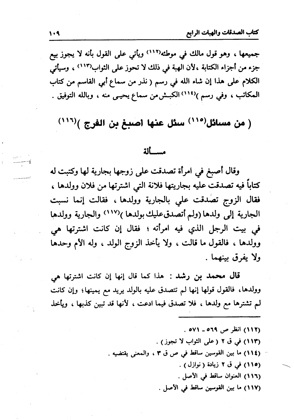 من مسائل سئل عنها أصبغ بن الفرج مسألة وقال أصبغ في امرأة تصدقت على زوجها بجارية لها، وكتبت له كتابا فيه تصدقت عليه بجاريتها فلانة التي اشترتها من فلان وولدها، فقال الزوج: تصدقت علي بالجارية وولدها، فقالت: إنما نسبت الجارية إلى ولدها، ولم أتصدق عليك بولدها، والجارية وولدها في بيت الرجل الذي فيه امرأته؛ فقال: إن كانت اشترتها هي وولدها، فالقول ما قالت، ولا يأخذ الزوج الولد، وله الأم وحدها، ولا يفرق بينهما.